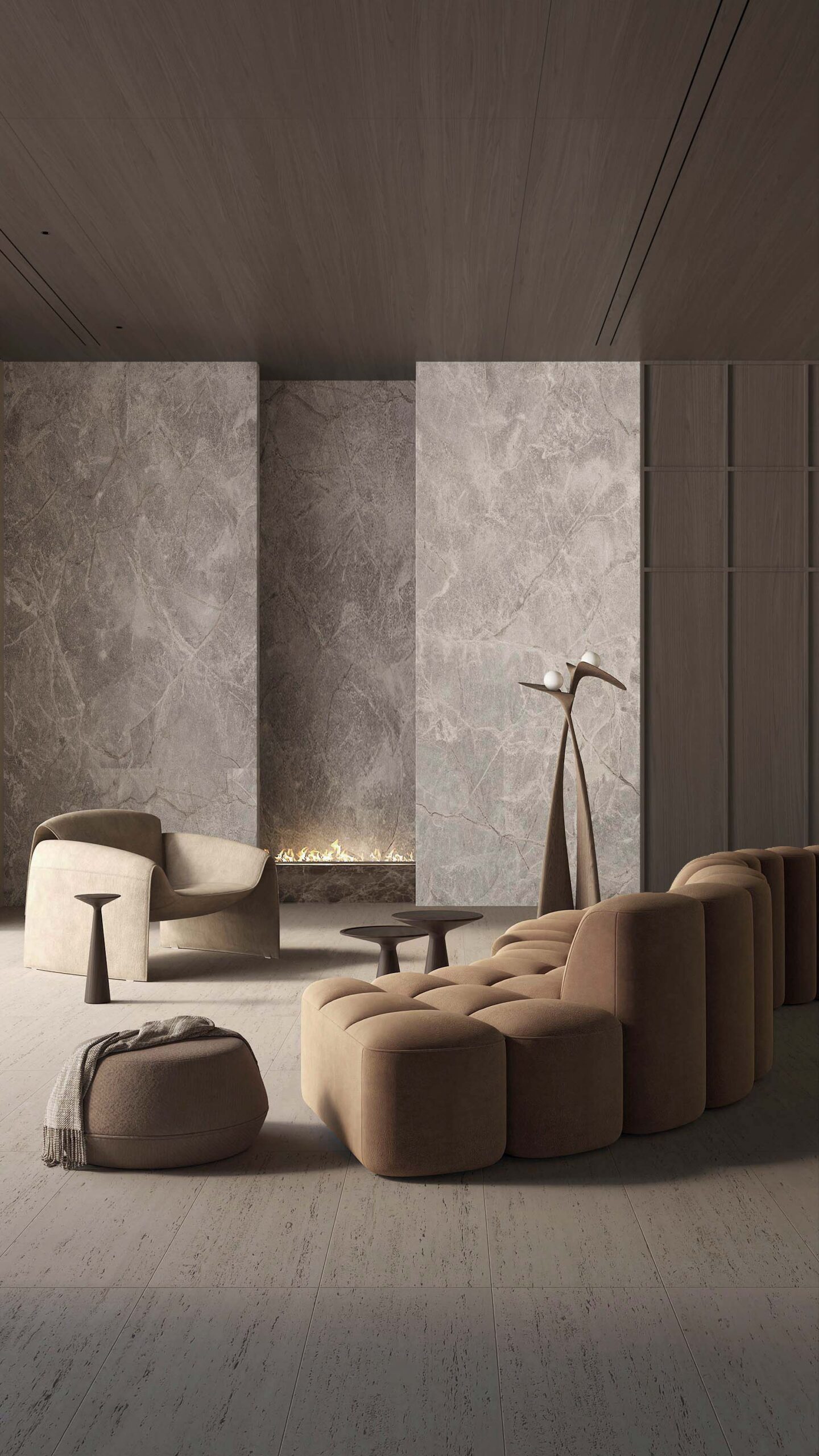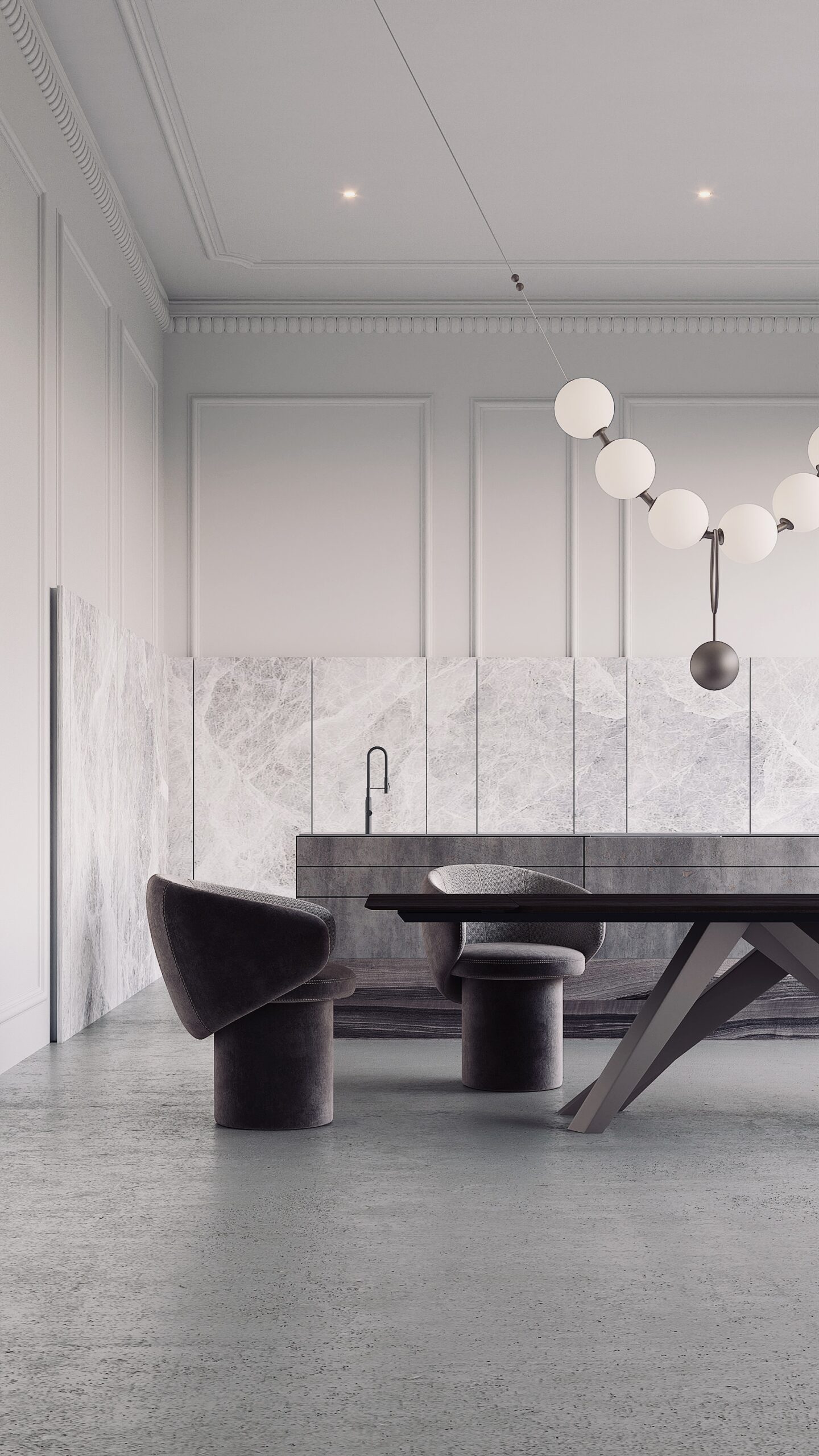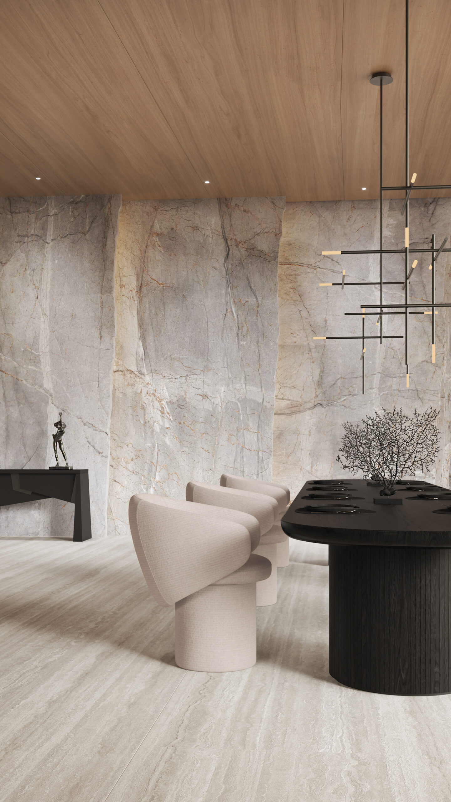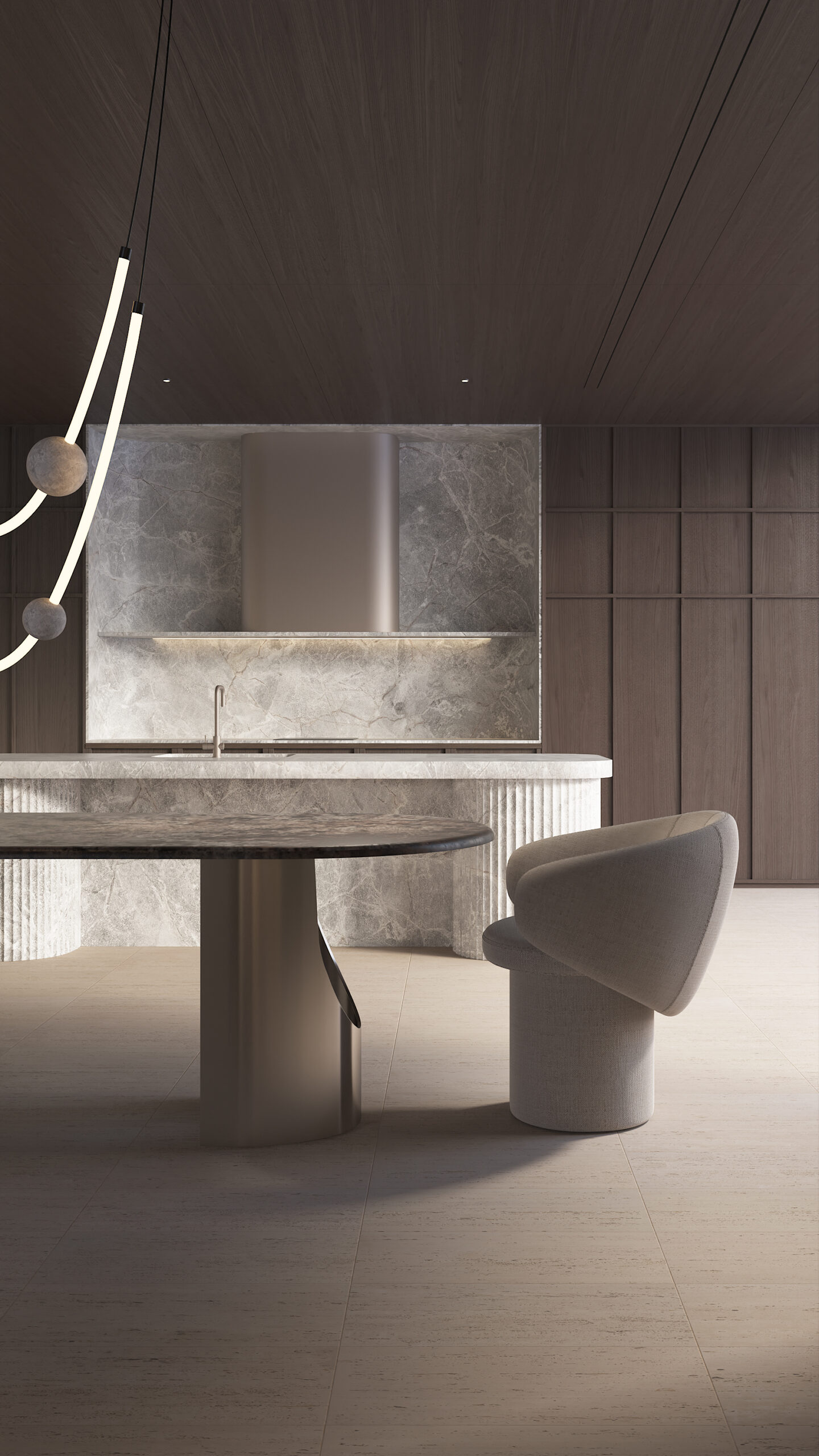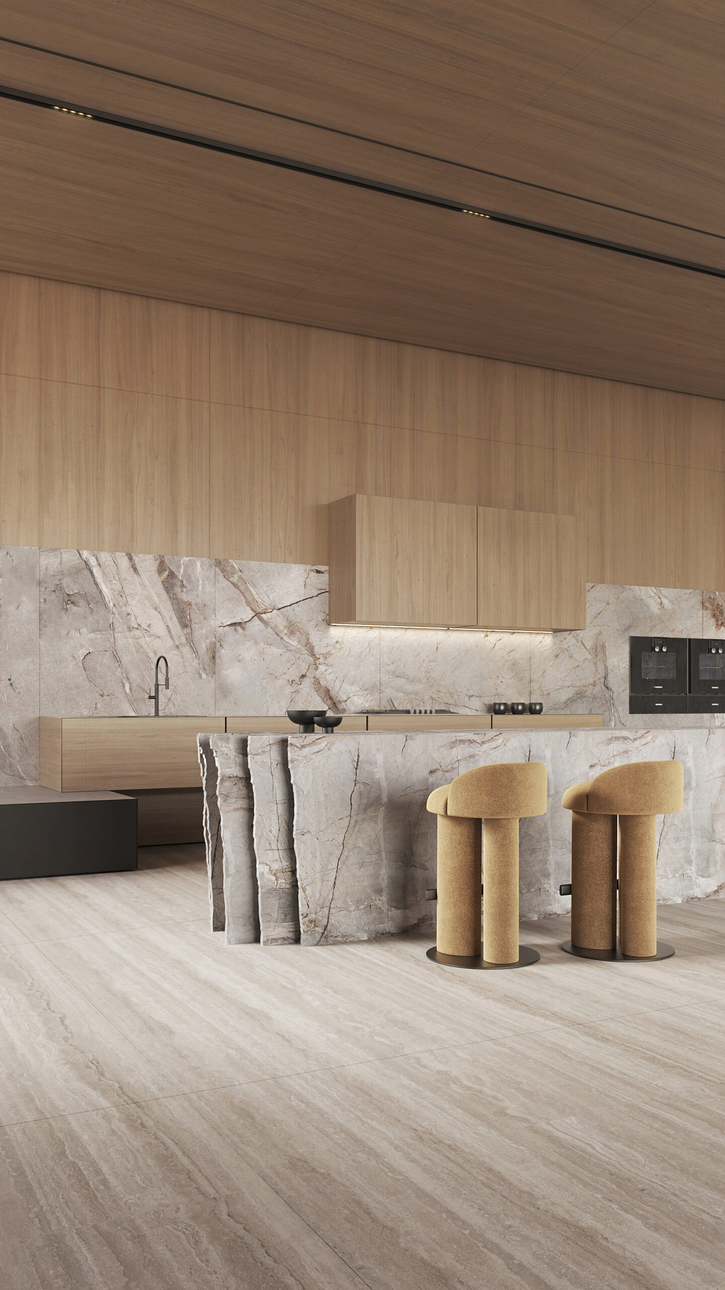 SLABS SERVE AS STRIKING ARCHITECTURAL STATEMENTS THROUGHOUT THE SPACE, THEIR BOLD VEINING ADDING DEPTH AND