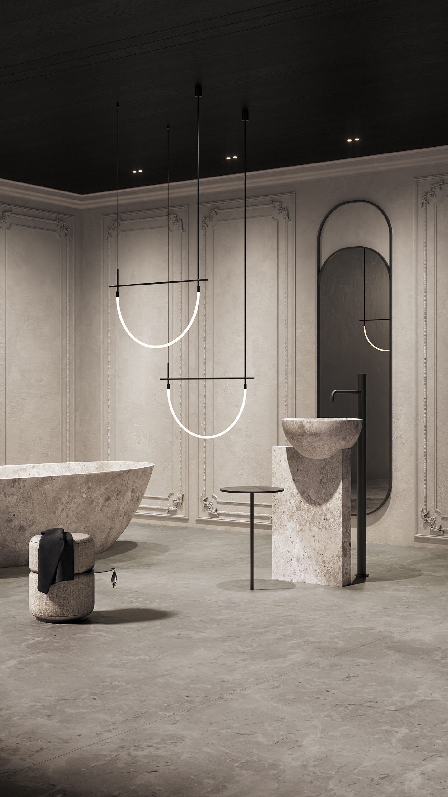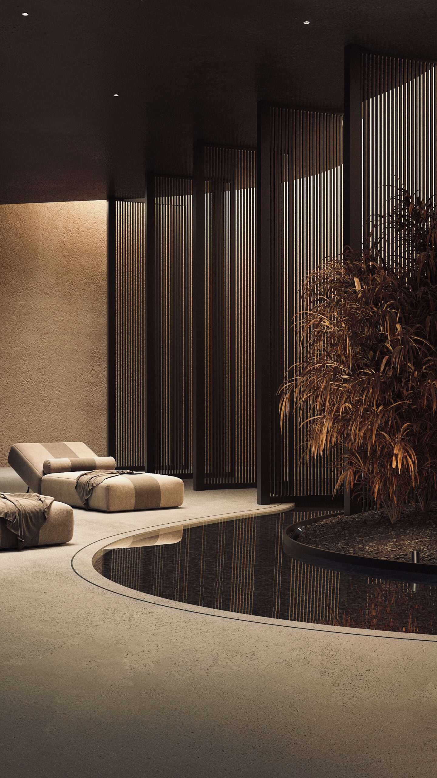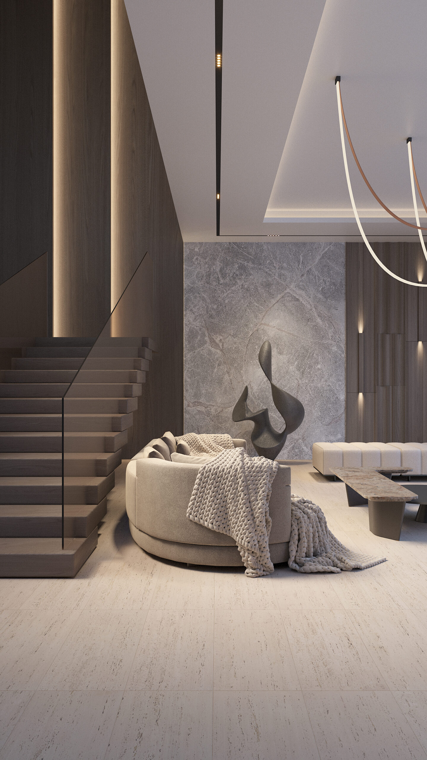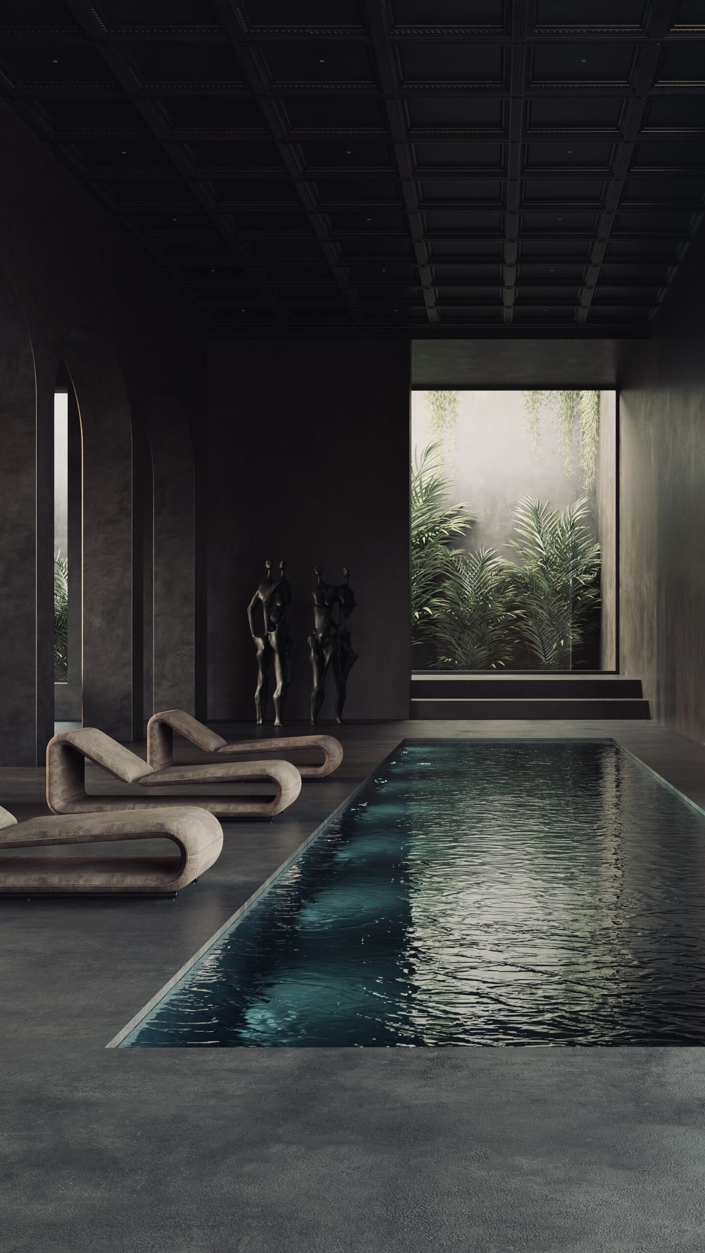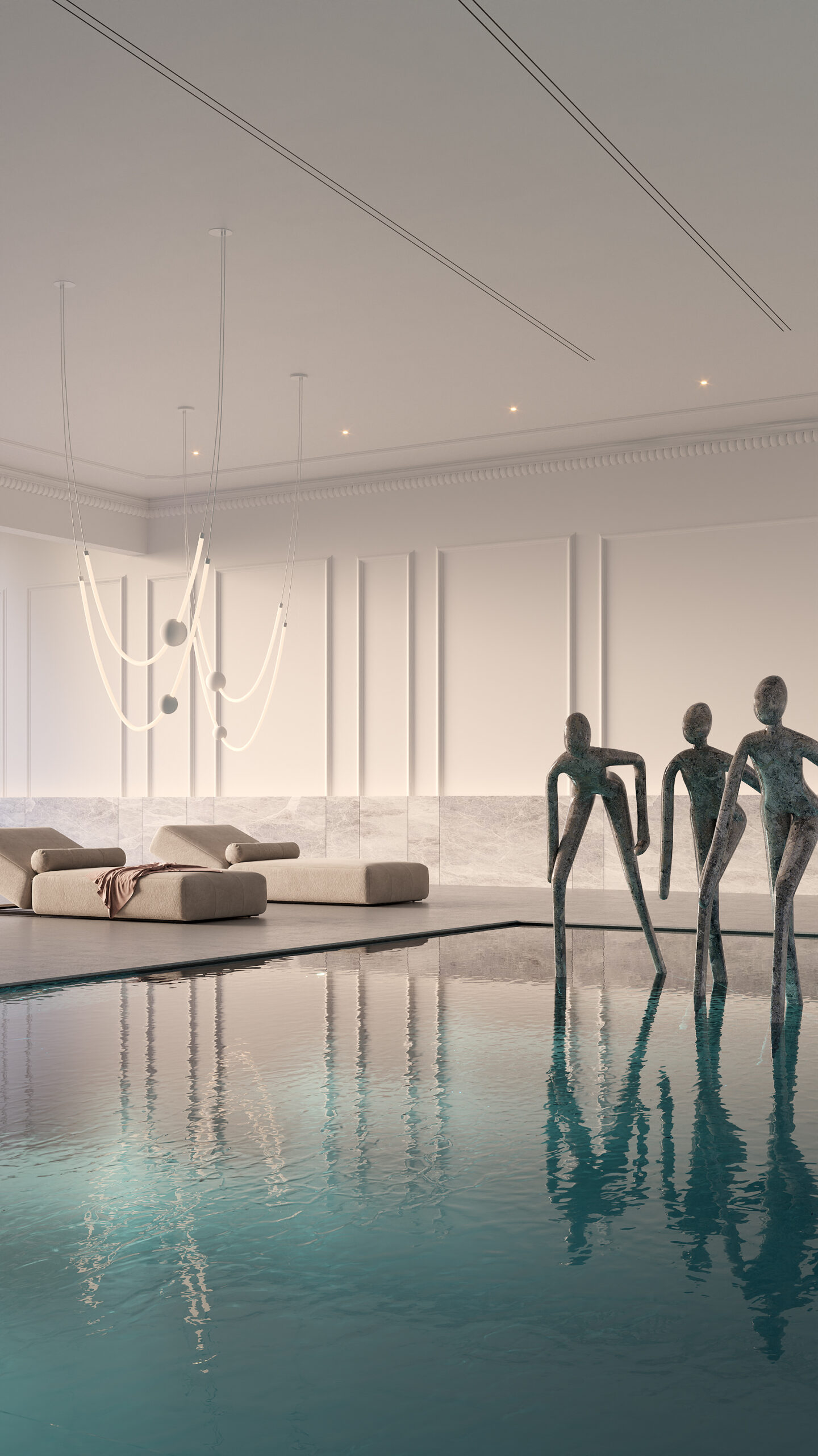 AT ITS HEART, AN INDOOR POOL SERVES AS A SERENE CENTERPIECE, FEATURING FLOATING SCULPTURES THAT ADD AN ARTISTIC AND ETHEREAL DIMENSION TO THE ENVIRONMENT. MODERN FURNISHINGS AND CAREFULLY CURATED LIGHTING COMPLETE THE DESIGN, BALANCING DRAMATIC ELEGANCE WITH COMFORT. THE OVERALL EFFECT IS A SOPHISTICATED, IMMERSIVE LIVING EXPERIENCE THAT REFLECTS DUBAI’S SIGNATURE LUXURY AND INNOVATION.