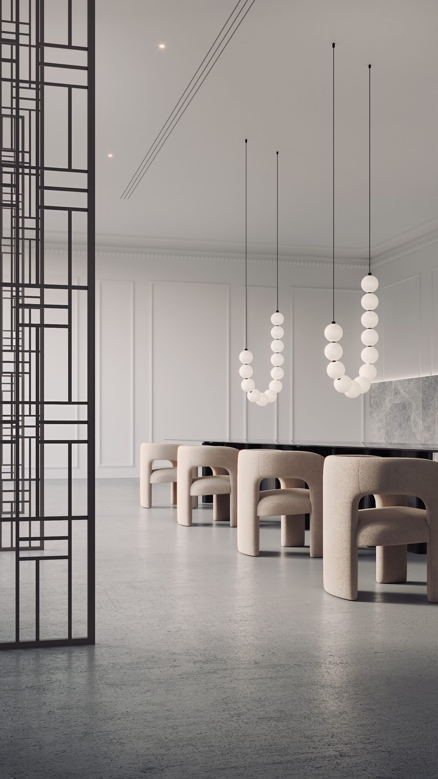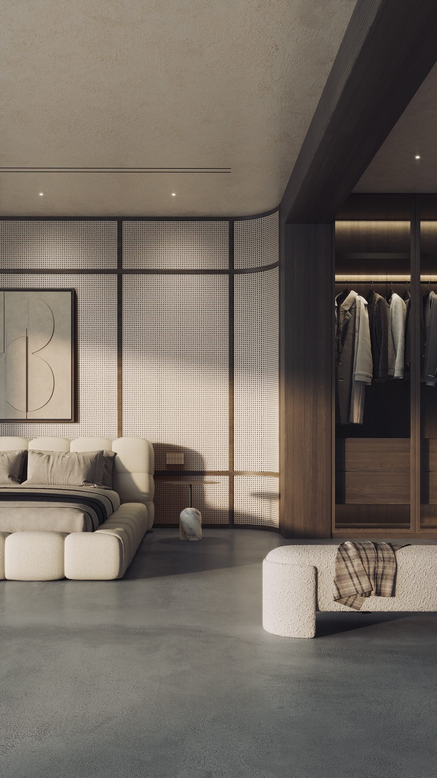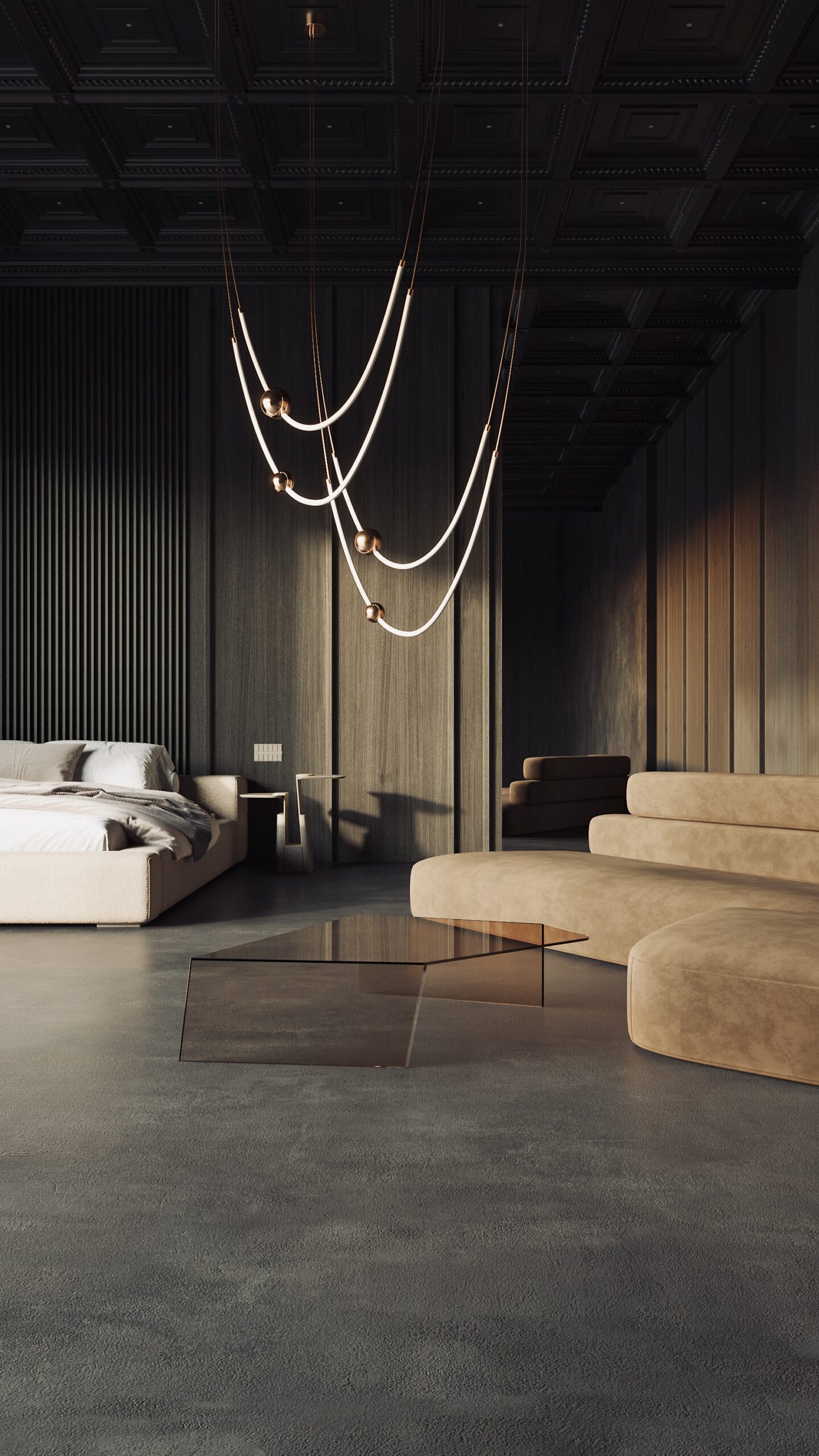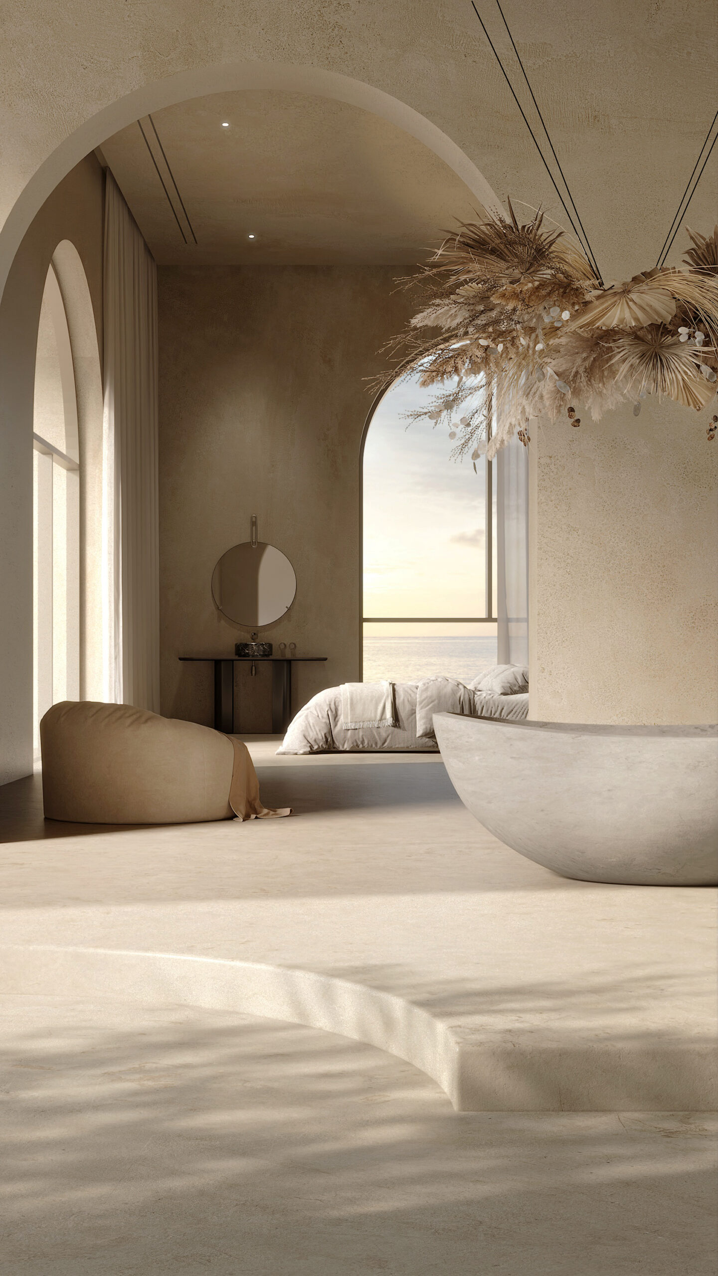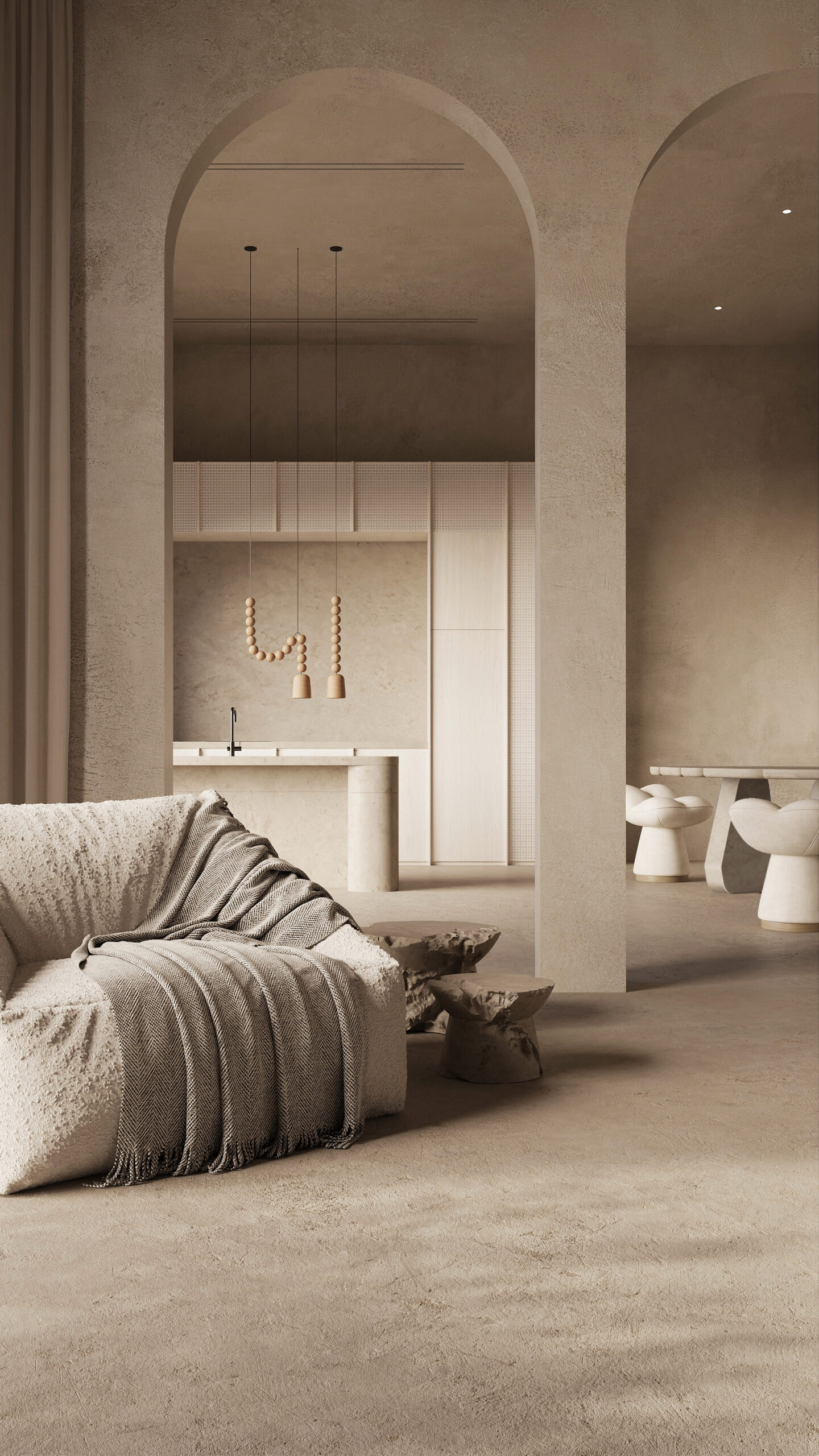 NATURAL CONCRETE FLOORS PROVIDE A SMOOTH, UNDERSTATED FOUNDATION THAT COMPLEMENTS THE ORGANIC PALETTE, WHILE MODERN DECORATIVE LIGHTING ADDS SCULPTURAL INTEREST AND ILLUMINATES THE SPACE WITH ELEGANCE. THE OVERALL DESIGN ACHIEVES A HARMONIOUS BALANCE BETWEEN MODERN SOPHISTICATION, NATURAL MATERIALS, AND A CALM, LUXURIOUS ISLAND LIFESTYLE.