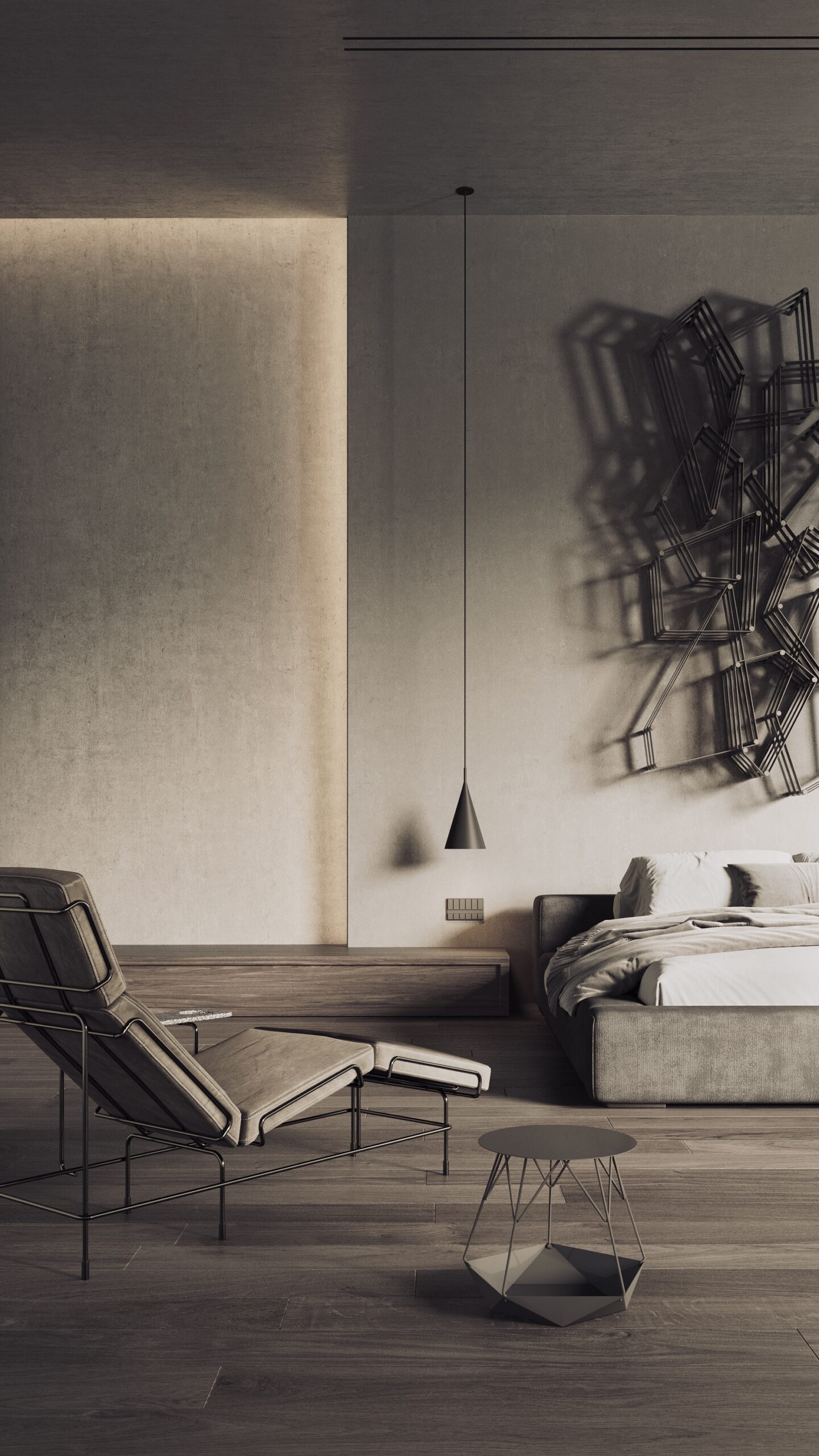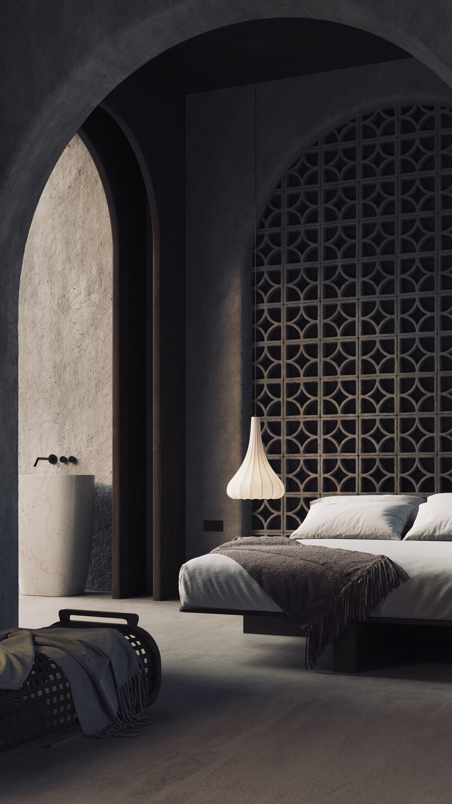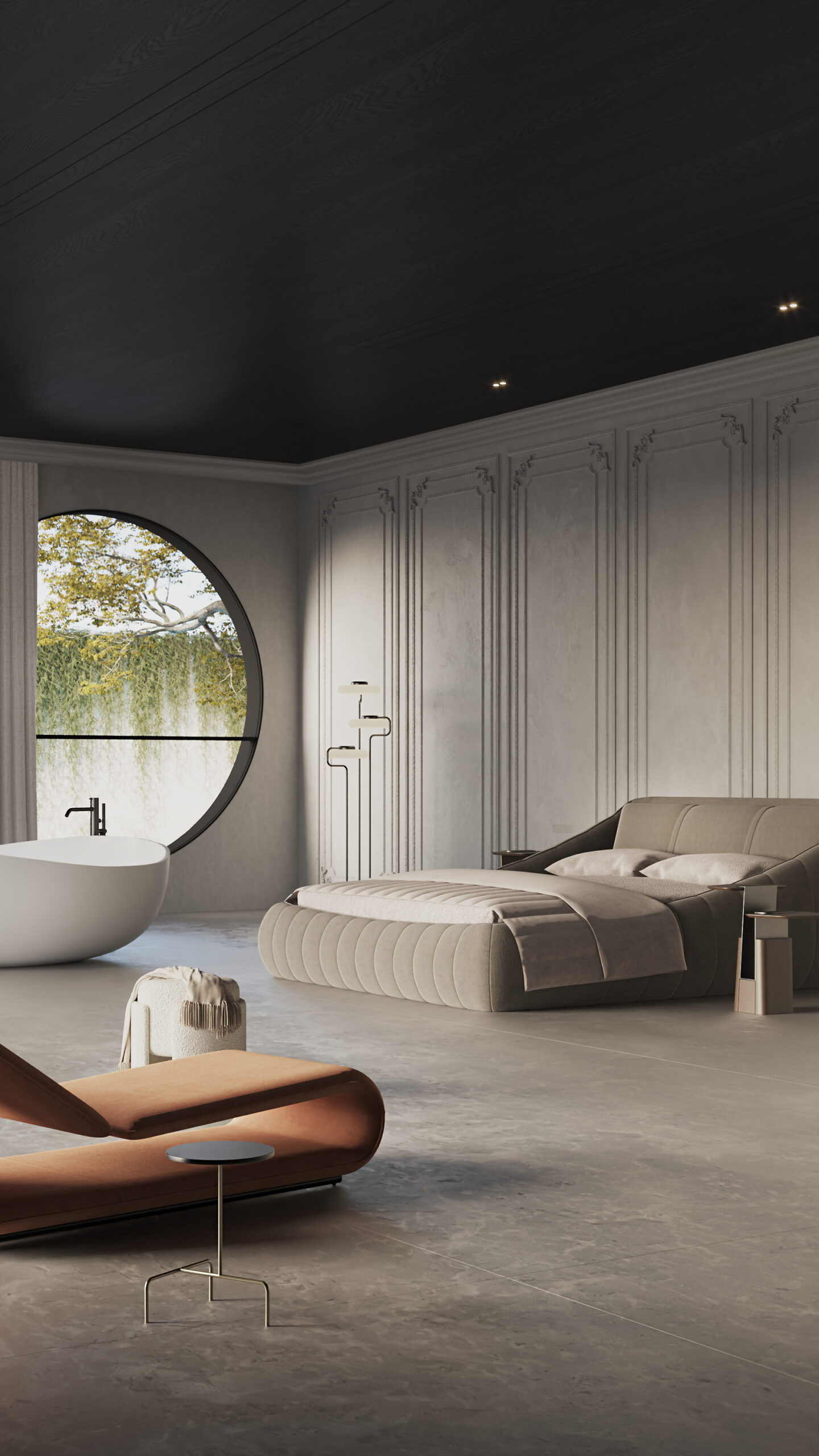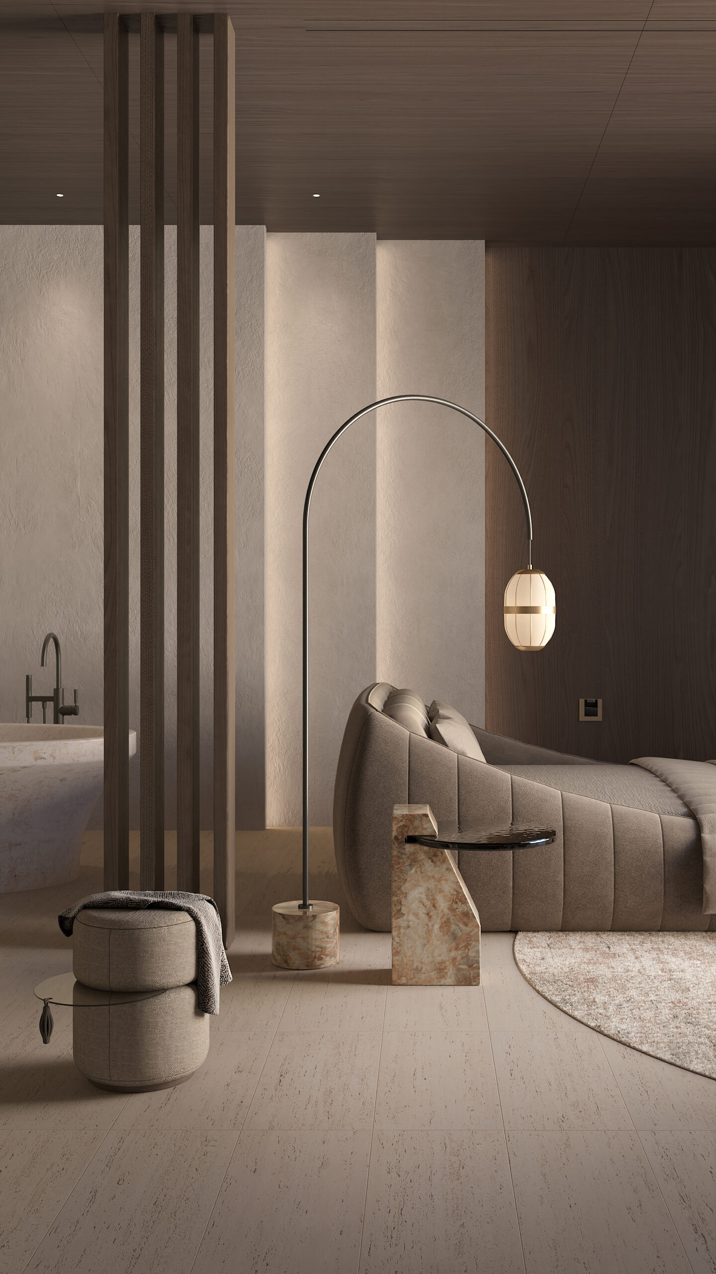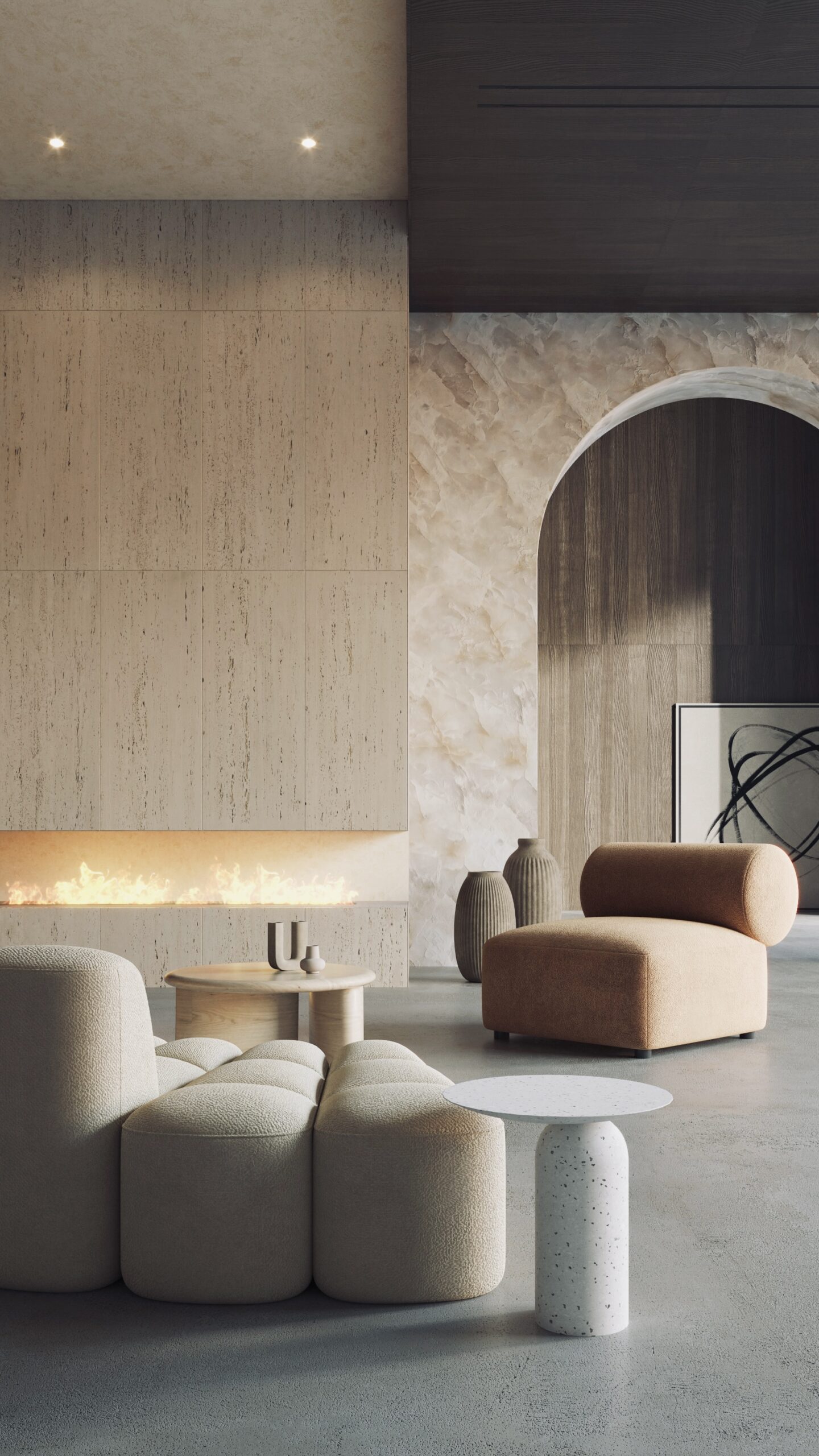 NATURAL CONCRETE FLOORS PROVIDE A SMOOTH, UNDERSTATED FOUNDATION THAT COMPLEMENTS THE ORGANIC PALETTE, WHILE MODERN DECORATIVE LIGHTING ADDS SCULPTURAL INTEREST AND ILLUMINATES THE SPACE WITH ELEGANCE. THE OVERALL DESIGN ACHIEVES A HARMONIOUS BALANCE BETWEEN MODERN SOPHISTICATION, NATURAL MATERIALS, AND A CALM, LUXURIOUS ISLAND LIFESTYLE.