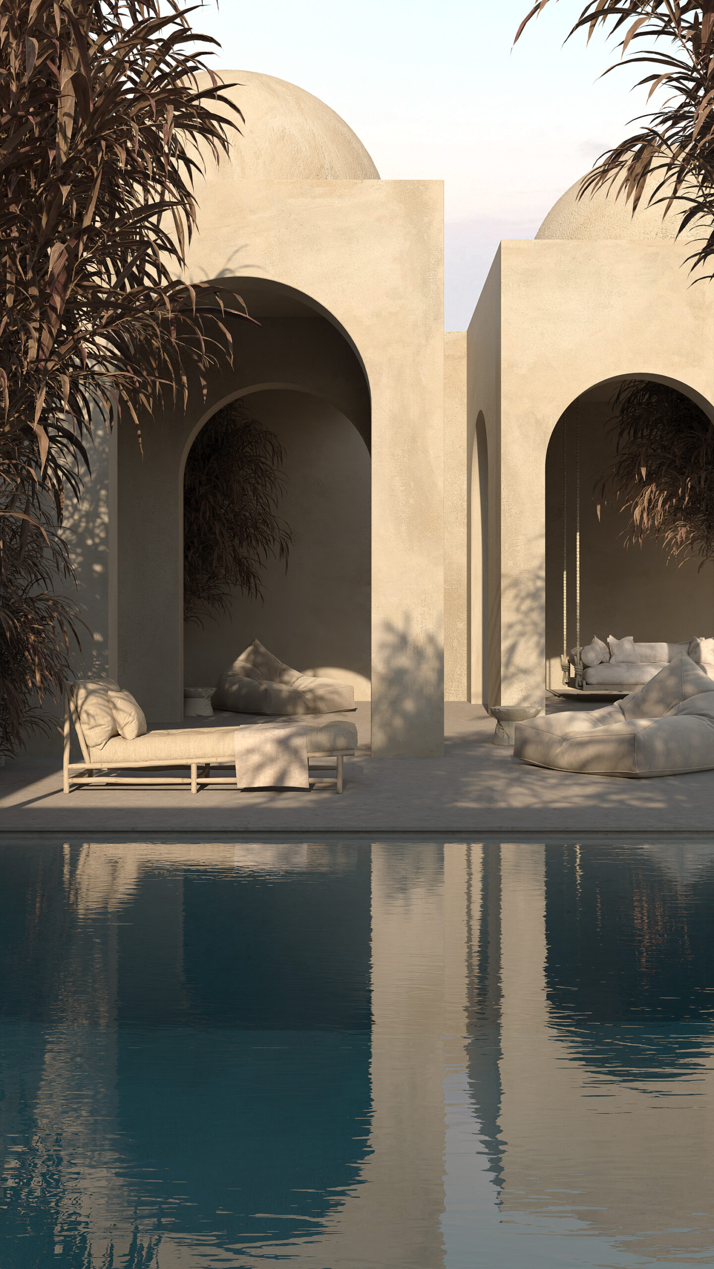 GRACEFUL ARCHED OPENINGS FRAME VIEWS OF THE OUTDOORS, FILLING THE VILLA WITH NATURAL LIGHT AND CREATING A SEAMLESS CONNECTION BETWEEN INSIDE AND OUTSIDE. THE DESIGN BALANCES CLEAN, MODERN LINES WITH TIMELESS MATERIALS, RESULTING IN A SERENE, REFINED RETREAT THAT CELEBRATES BOTH SIMPLICITY AND THE ISLAND’S ARCHITECTURAL HERITAGE.
