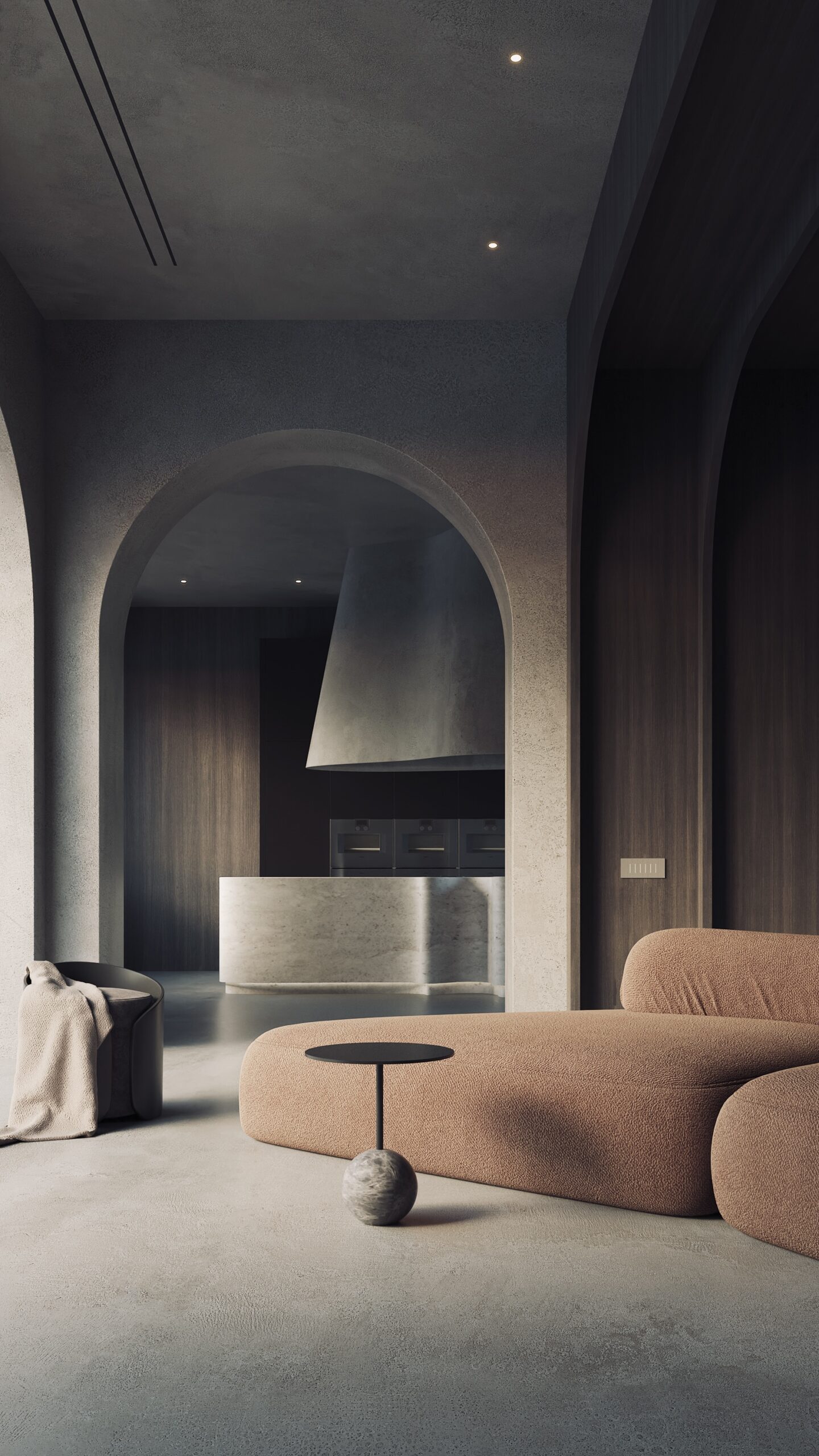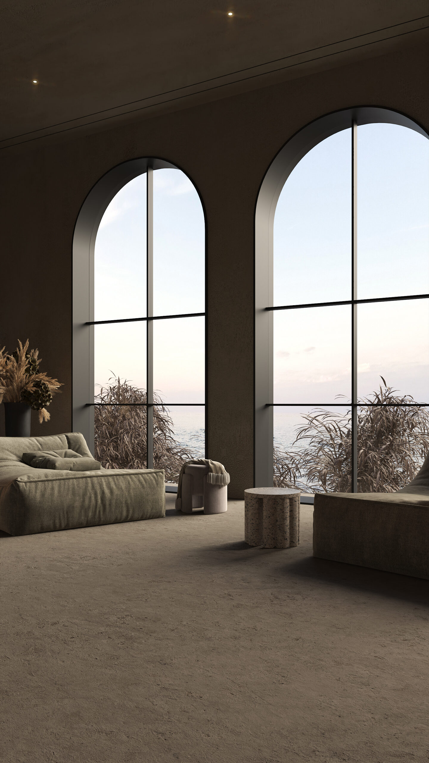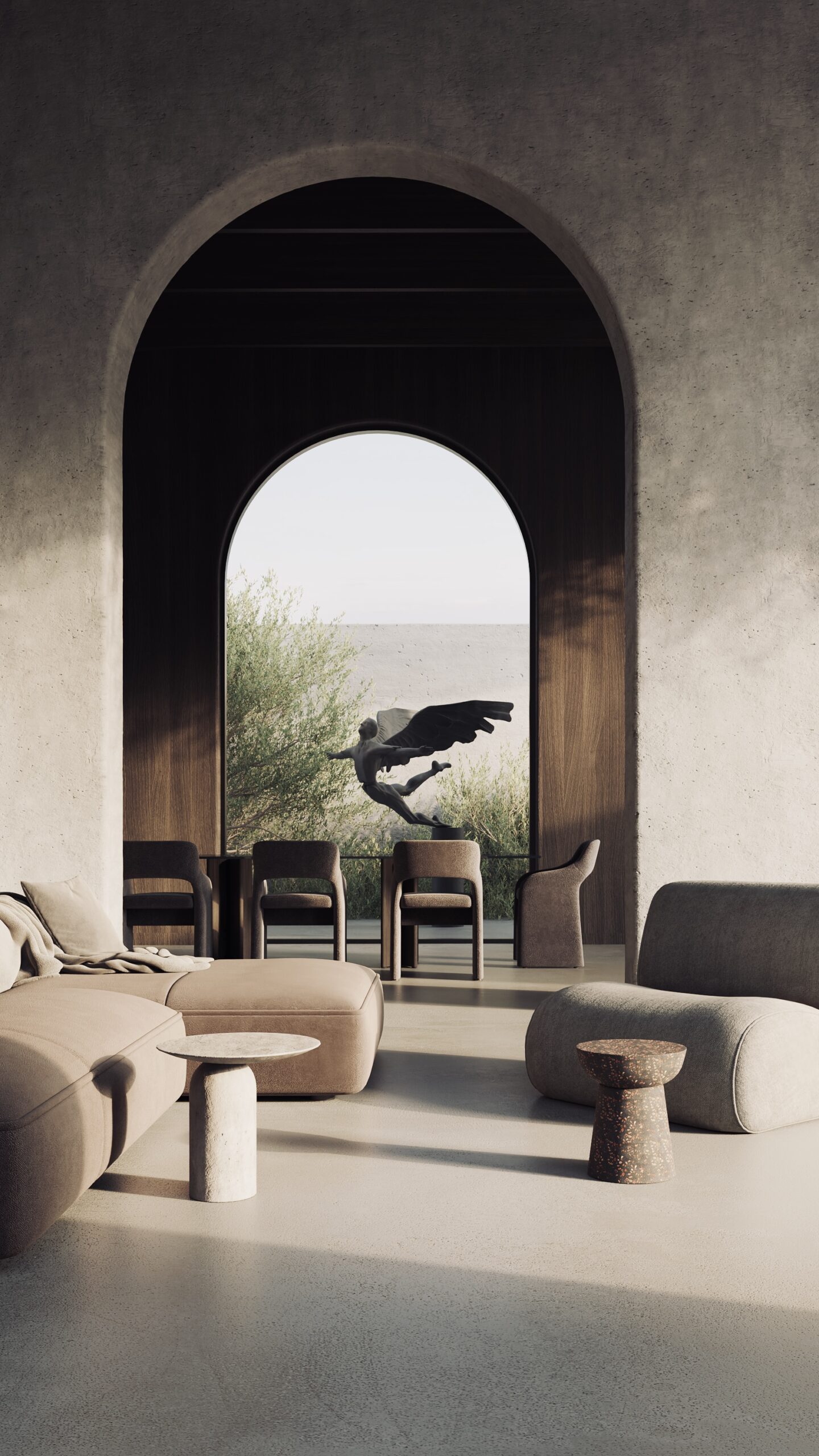 A CONTEMPORARY VILLA IN CRETE EMBRACES THE ISLAND’S SERENE LANDSCAPE WITH EXPANSIVE ARCHED OPENINGS THAT FRAME UNINTERRUPTED VIEWS OF THE OUTDOOR POOL AND THE SUN-WASHED SURROUNDINGS. NATURAL CONCRETE FLOORS FLOW SEAMLESSLY THROUGHOUT THE INTERIOR, ADDING A COOL, EFFORTLESS ELEGANCE THAT COMPLEMENTS THE MEDITERRANEAN CLIMATE.