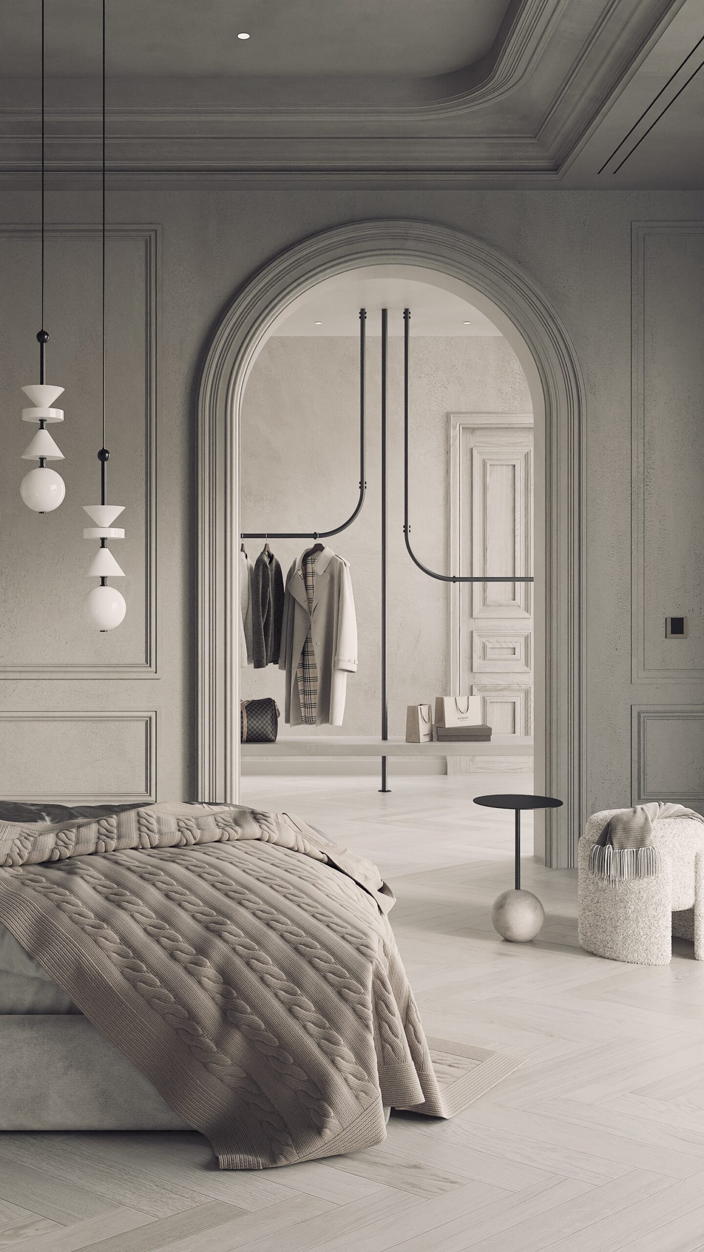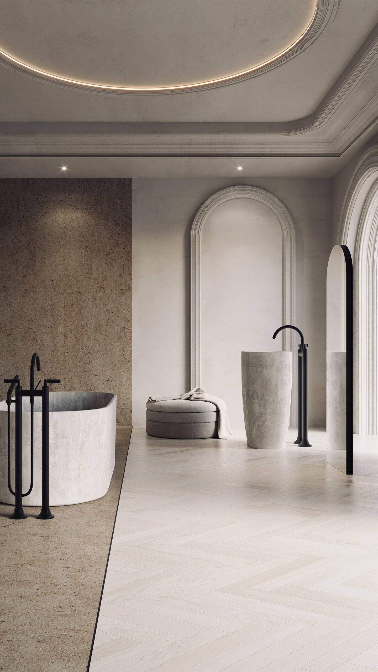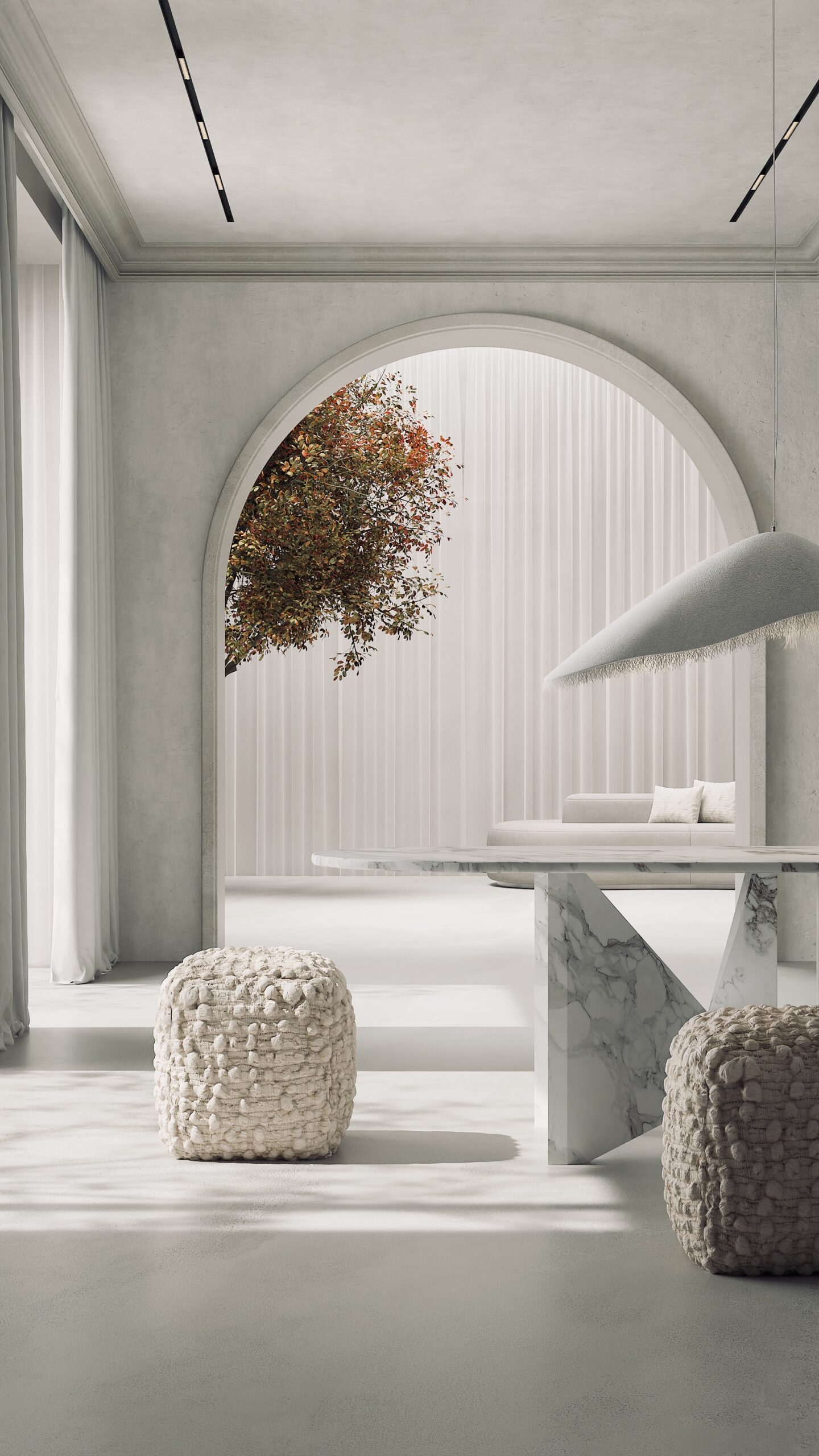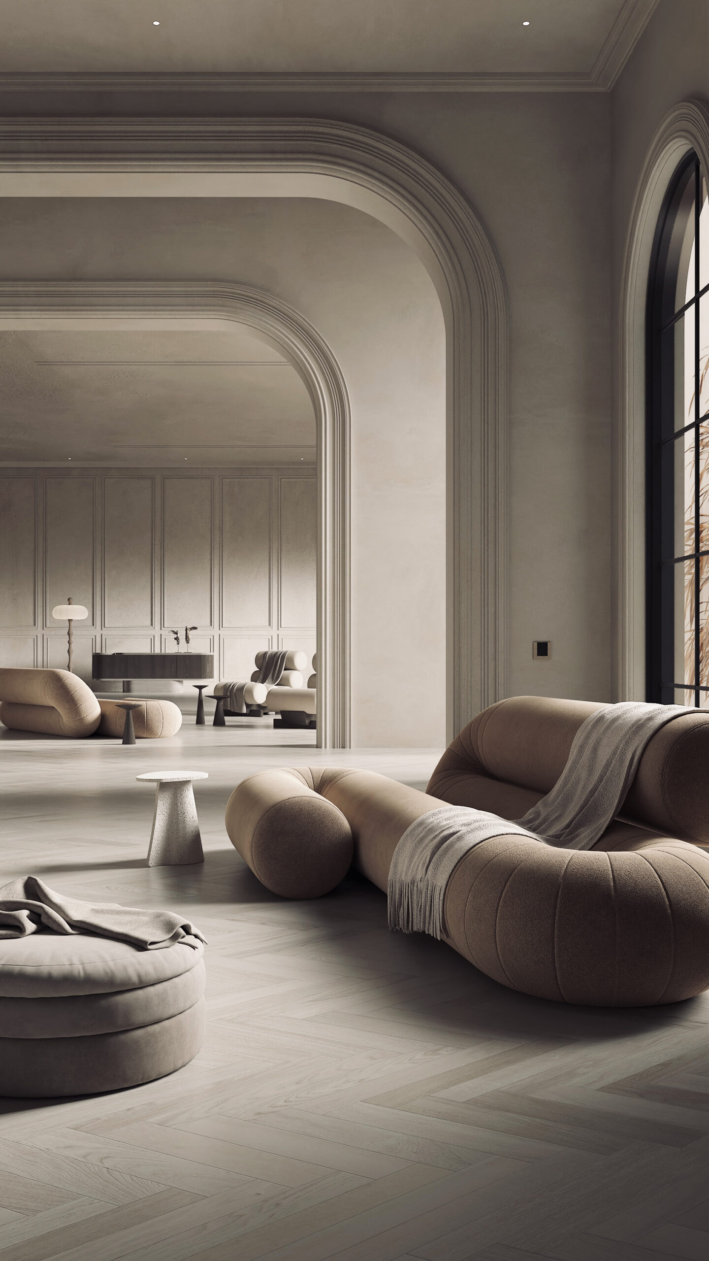MODERN FURNITURE IN NATURAL TONES COMPLEMENTS THE ARCHITECTURAL ELEMENTS, OFFERING CLEAN LINES AND UNDERSTATED SOPHISTICATION WHILE MAINTAINING A WARM, INVITING ATMOSPHERE. THE OVERALL DESIGN BALANCES CLASSIC ROMAN CHARACTER WITH CONTEMPORARY COMFORT, CREATING A LUXURIOUS YET HARMONIOUS LIVING ENVIRONMENT.