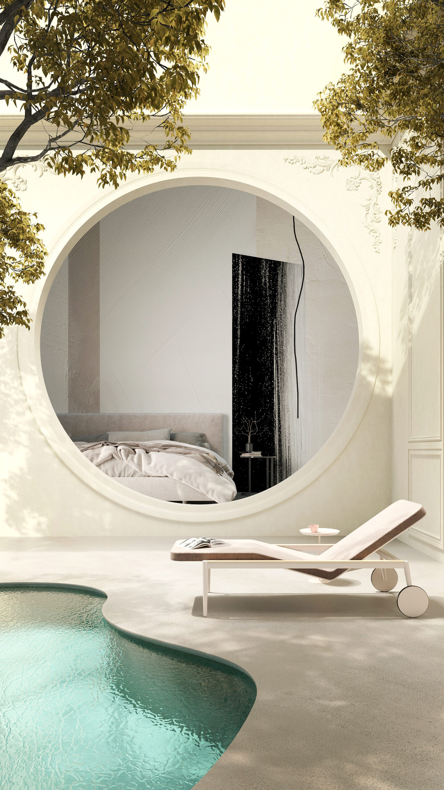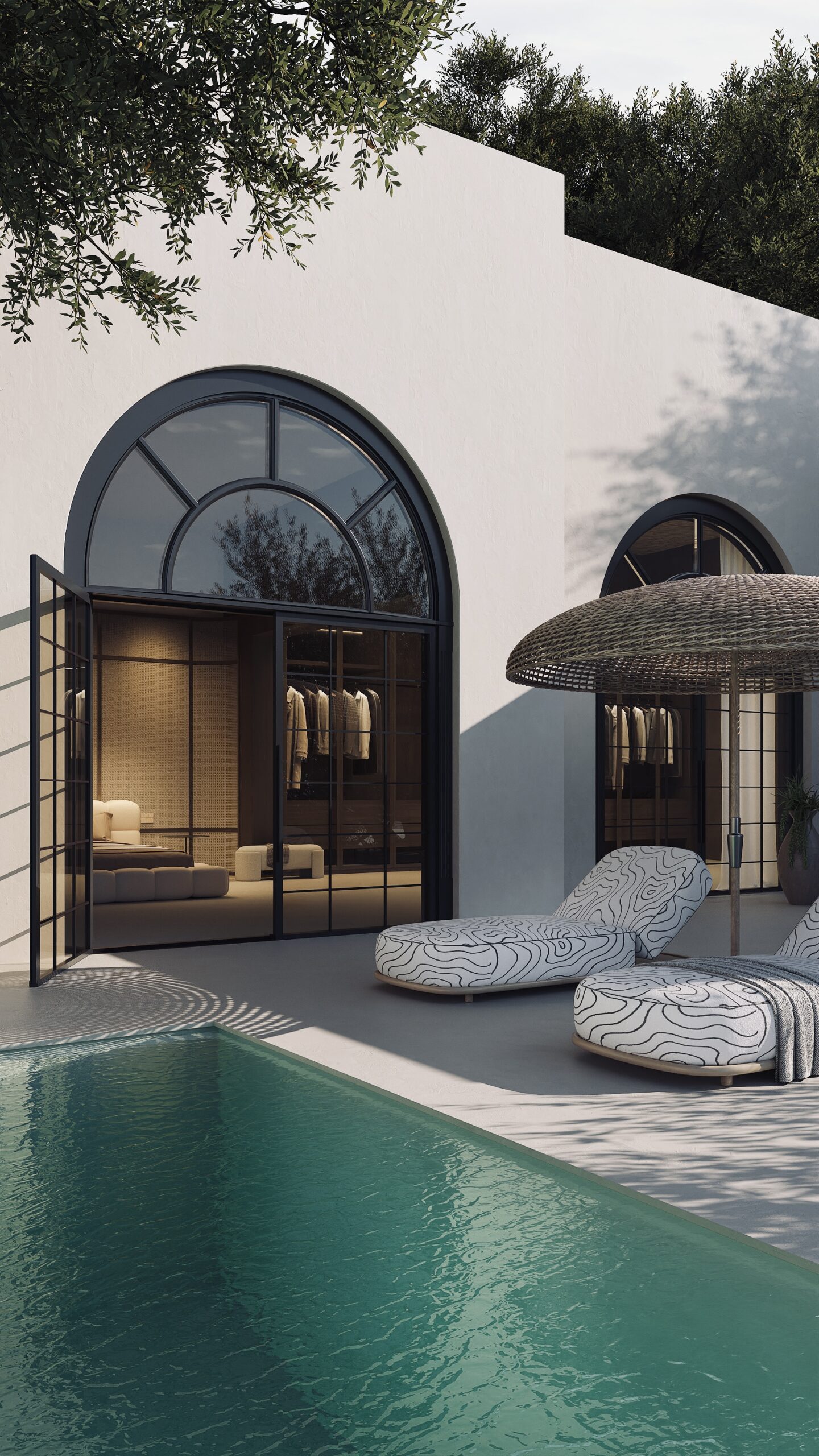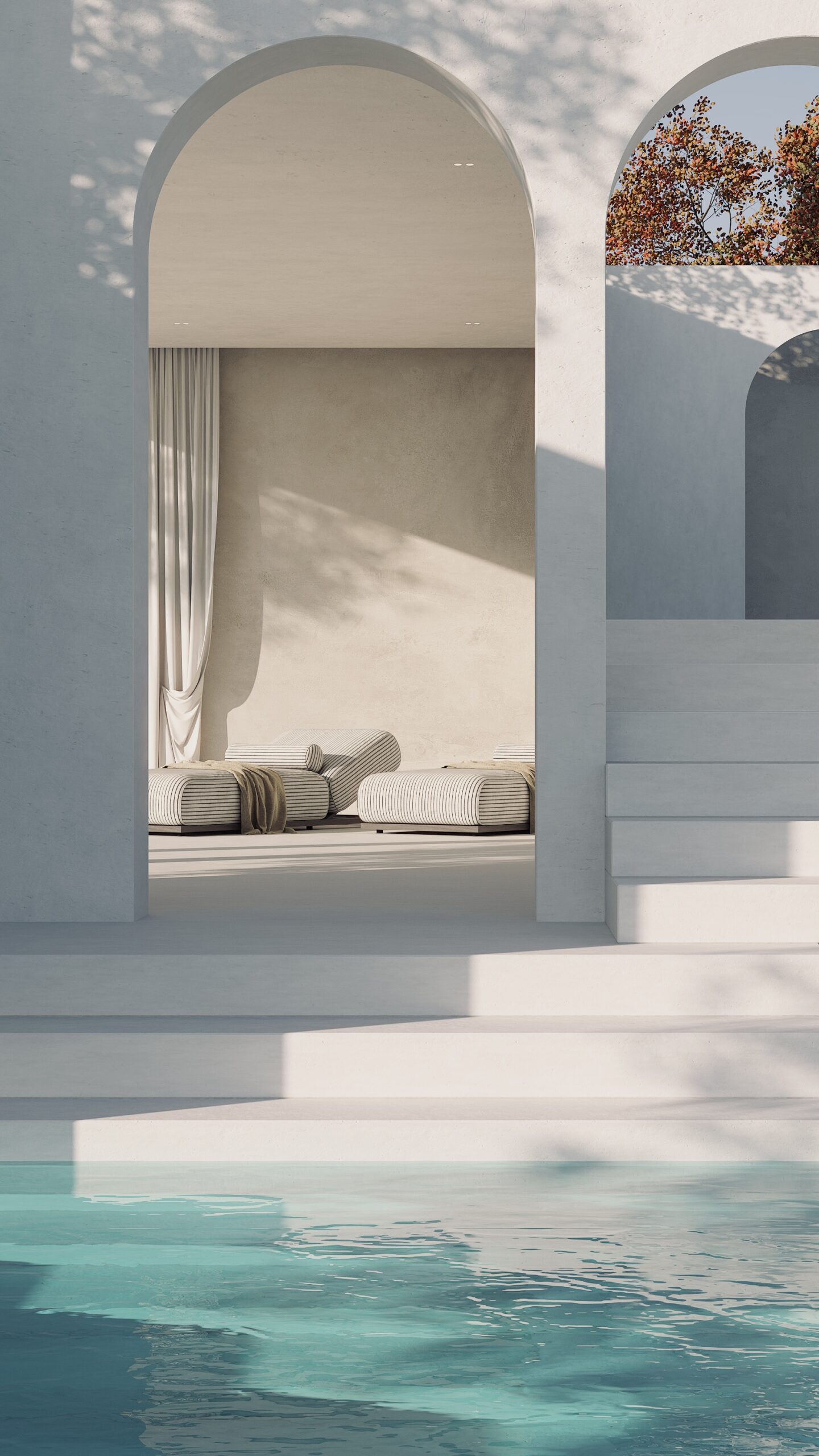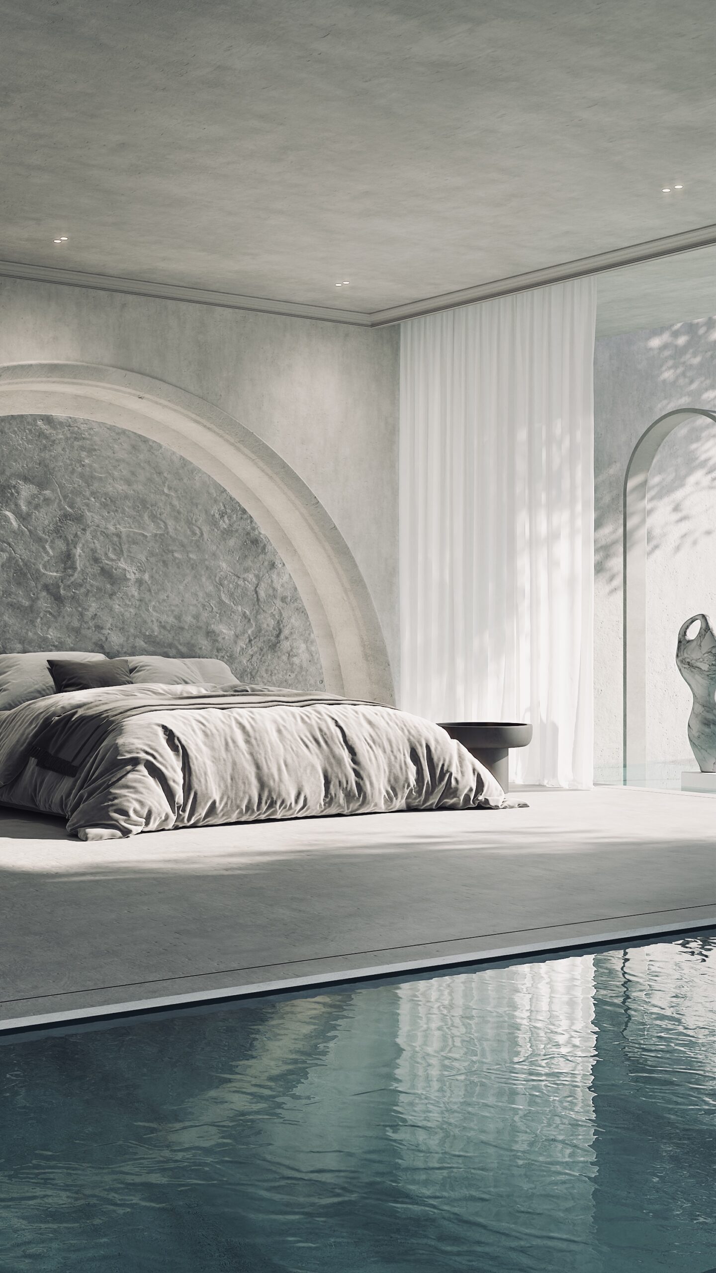 A MINIMALIST VILLA IN MYKONOS UNFOLDS IN PURE WHITE CONCRETE FINISHES, REFLECTING THE ISLAND’S ICONIC ARCHITECTURAL LANGUAGE WHILE MAINTAINING A CONTEMPORARY, SCULPTURAL IDENTITY. AT ITS HEART, AN INDOOR–OUTDOOR POOL BLURS THE BOUNDARIES BETWEEN INTERIOR AND EXTERIOR, ITS CALM SURFACE EXTENDING TOWARD THE HORIZON. IN THE BEDROOM, OVERSIZED STEPS DESCEND DIRECTLY INTO THE POOL, CONTINUING OUTDOORS TO CREATE A SEAMLESS FLOW AND A SENSE OF IMMERSIVE RELAXATION.