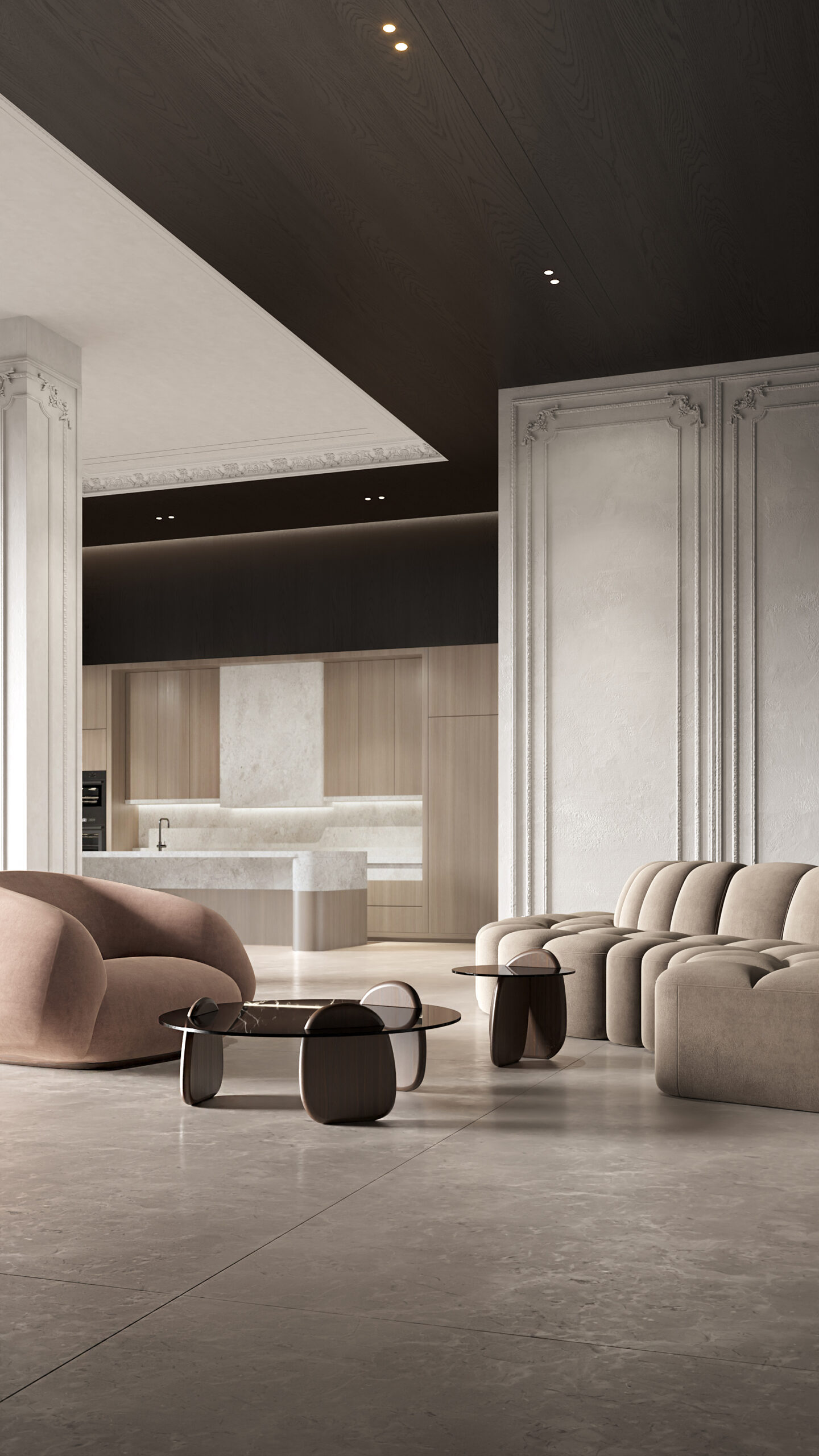 THIS ATHENS VILLA HARMONIOUSLY BLENDS CLASSICAL ELEGANCE WITH MODERN COMFORT. THE INTERIORS FEATURE TIMELESS WALL FRAMES THAT EVOKE TRADITIONAL ATHENIAN ARCHITECTURE, PAIRED WITH WARM WOODEN CEILINGS THAT ADD TEXTURE AND INTIMACY. EXPANSIVE LARGE-SLAB FLOORING CREATES A SEAMLESS, AIRY FOUNDATION THROUGHOUT THE OPEN SPACES, EMPHASIZING SCALE AND CONTINUITY.