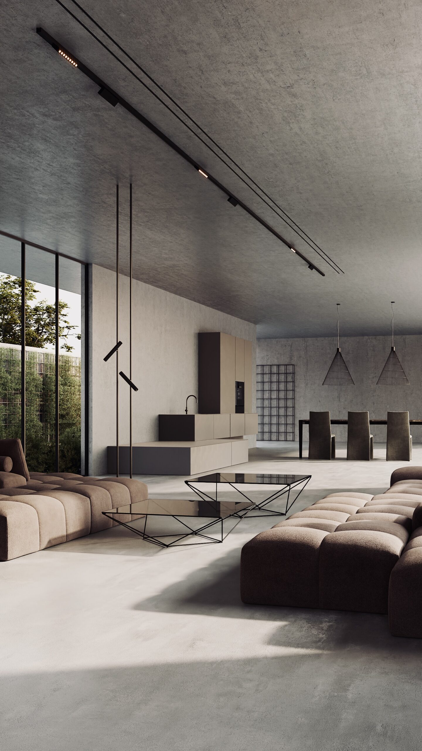 SMOOTH CONCRETE FLOORS EXTEND THROUGHOUT THE SPACE, BALANCING MODERN MINIMALISM WITH TACTILE ELEGANCE. THE HIGH CEILING ENHANCES OPENNESS AND LIGHT, WHILE CLASSIC TOUCHES—EXPRESSED THROUGH REFINED DETAILS AND BALANCED PROPORTIONS—ADD TIMELESS CHARACTER. THE RESULT IS A VILLA THAT FEELS BOTH MODERN AND GRACEFULLY ROOTED IN ATHENIAN TRADITION.