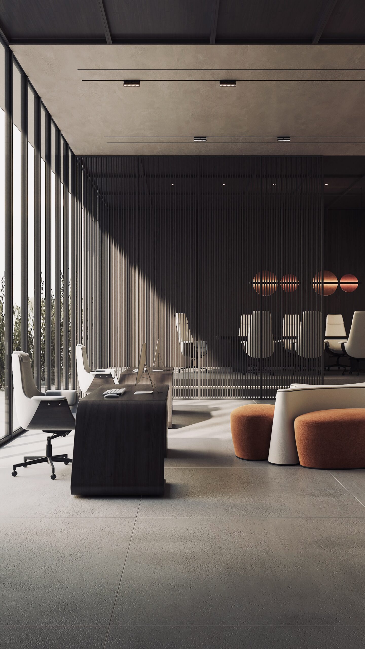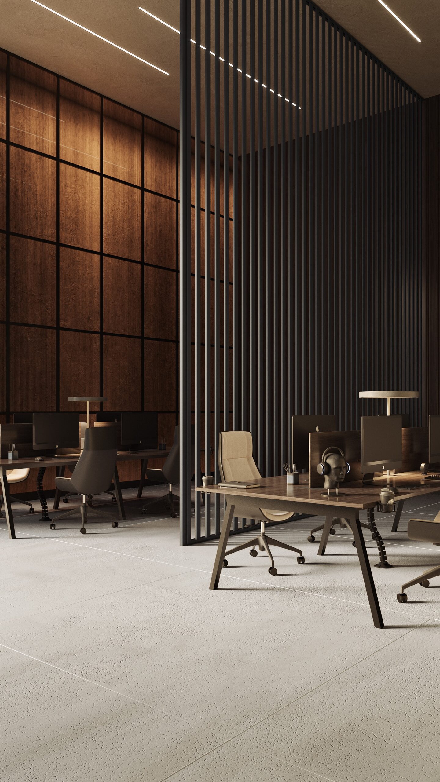 A MODERN PRIVATE OFFICE IN LIMASSOL COMBINES SLEEK CONTEMPORARY AESTHETICS WITH NATURAL TEXTURES AND THOUGHTFUL SPATIAL PLANNING. EXPANSIVE NATURAL FLOOR SLABS CREATE A SENSE OF OPENNESS AND CONTINUITY THROUGHOUT THE WORKSPACE, WHILE WARM WOODEN PANEL WALLS AND DETAILING INTRODUCE TEXTURE AND ELEGANCE. ALUMINUM PANEL DIVIDERS SUBTLY DEFINE FUNCTIONAL AREAS WITHOUT DISRUPTING THE VISUAL FLOW, MAINTAINING A LIGHT AND AIRY ATMOSPHERE.