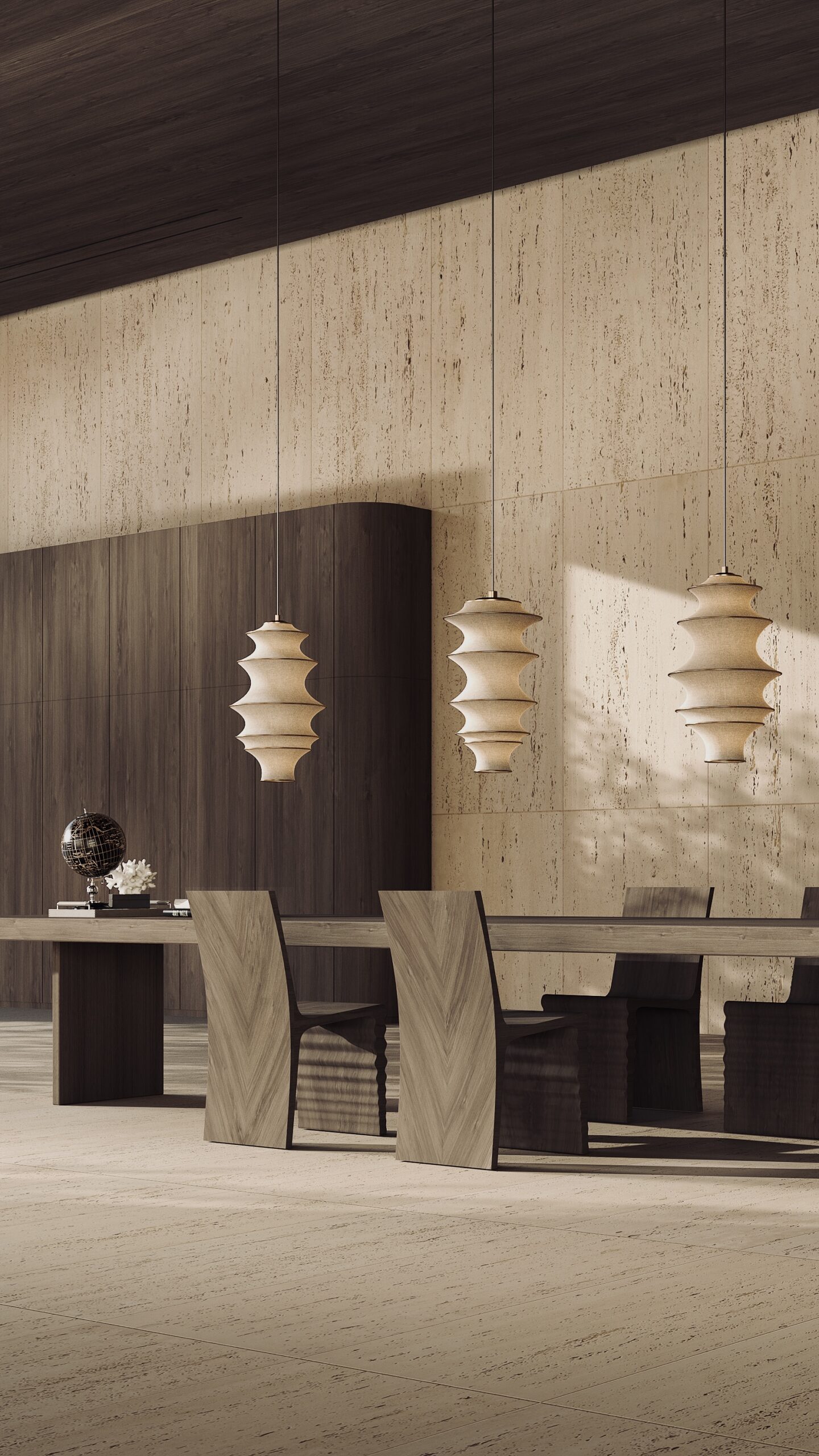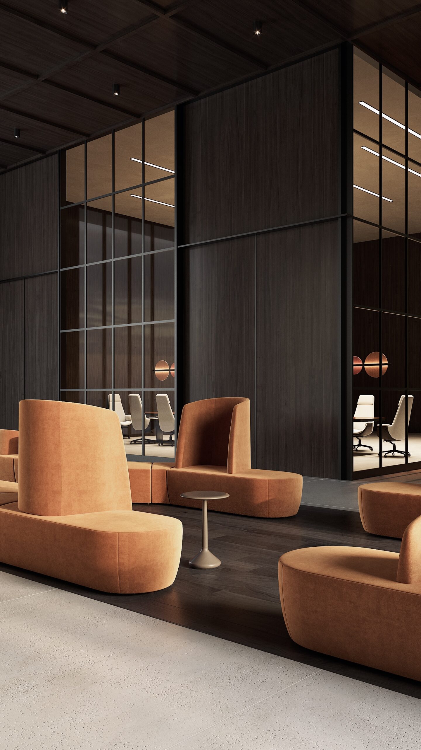 A LARGE, WELL-APPOINTED CONFERENCE ROOM SERVES AS THE CENTERPIECE, OFFERING A PROFESSIONAL YET INVITING ENVIRONMENT FOR COLLABORATION. THE DESIGN STRIKES A BALANCE BETWEEN MODERN MINIMALISM AND REFINED MATERIALITY, FOSTERING BOTH PRODUCTIVITY AND COMFORT.