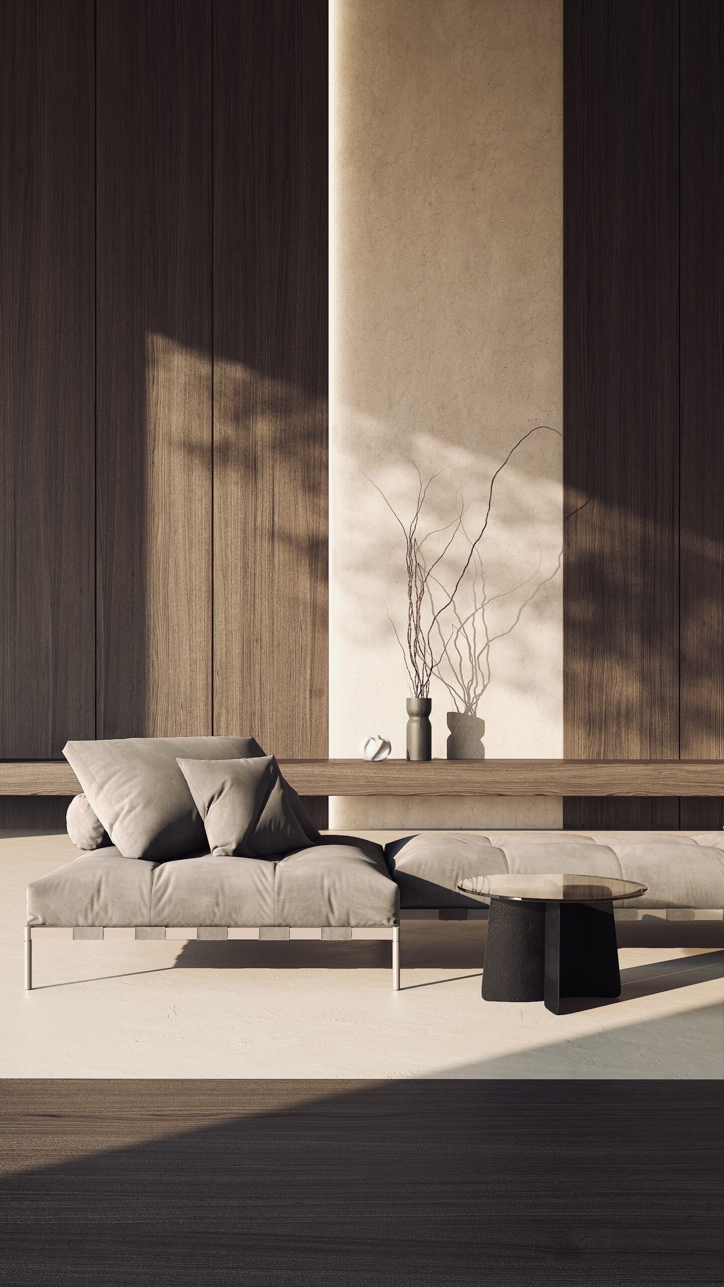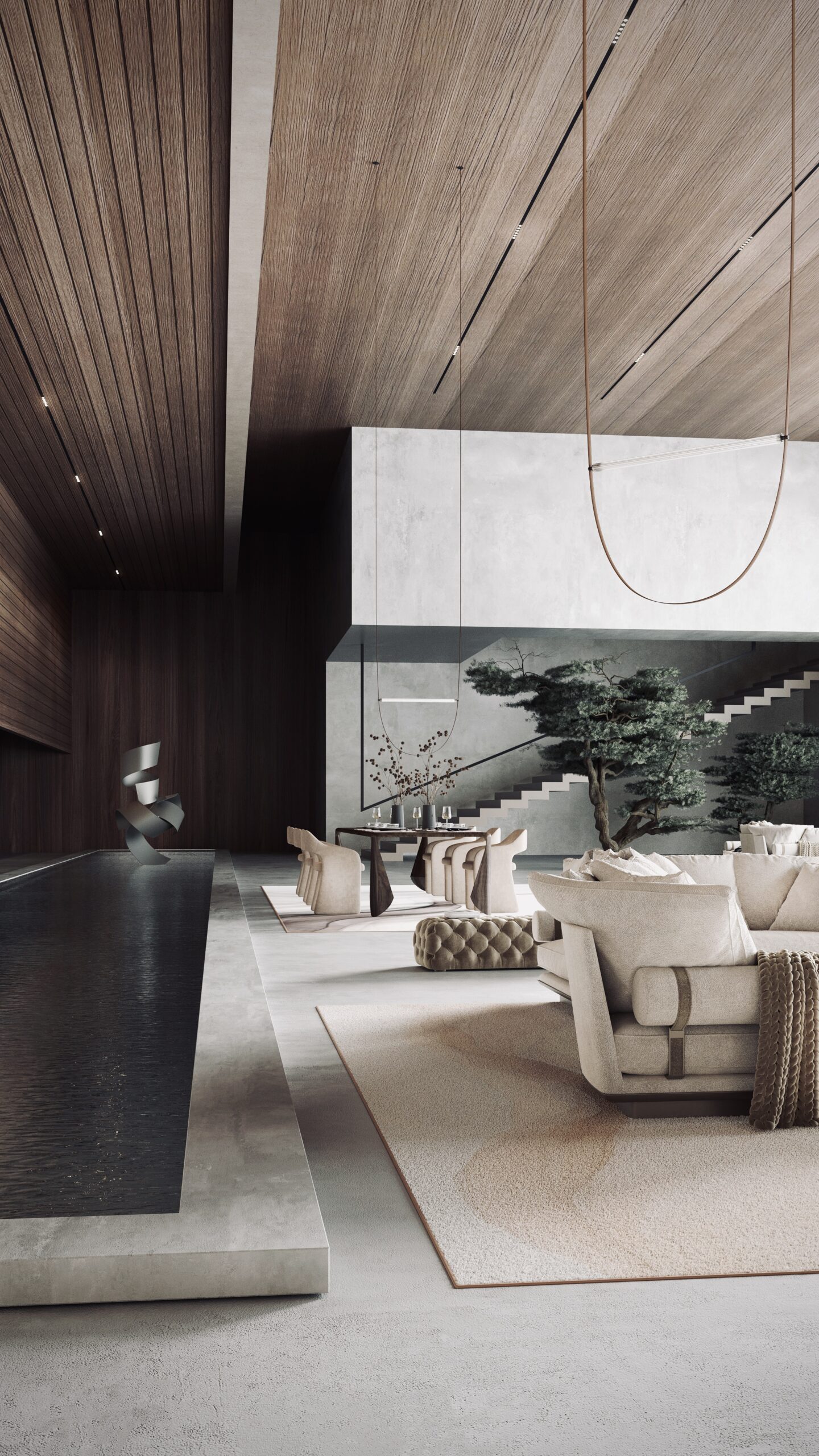 THE HIGH CEILING AMPLIFIES THE AIRY ATMOSPHERE, ALLOWING LIGHT TO POUR IN AND ENHANCING THE SENSE OF OPENNESS. WARM WOODEN WALL PANELS INTRODUCE AN EARTHY CONTRAST, GROUNDING THE MODERN ARCHITECTURE WITH ORGANIC TEXTURE. THE RESULT IS A HARMONIOUS BLEND OF MINIMALISM AND COASTAL TRANQUILITY—A VILLA THAT FEELS BOTH SCULPTURAL AND DEEPLY CONNECTED TO ITS ENVIRONMENT.