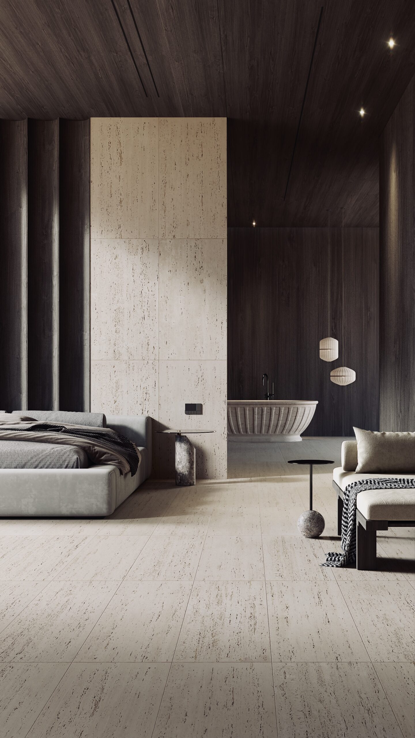THIS ROME-BASED VILLA SEAMLESSLY BLENDS CONTEMPORARY DESIGN WITH THE TIMELESS CHARM OF LOCAL MATERIALS. THE FLOORS FEATURE EXQUISITE TRAVERTINE MARBLE, BRINGING NATURAL WARMTH AND TEXTURE THAT ANCHOR THE INTERIOR SPACES. WOODEN PANELS ON THE WALLS AND CEILINGS ADD DEPTH AND A TACTILE RICHNESS, HARMONIZING WITH THE MARBLE AND REINFORCING A SENSE OF REFINED ELEGANCE.