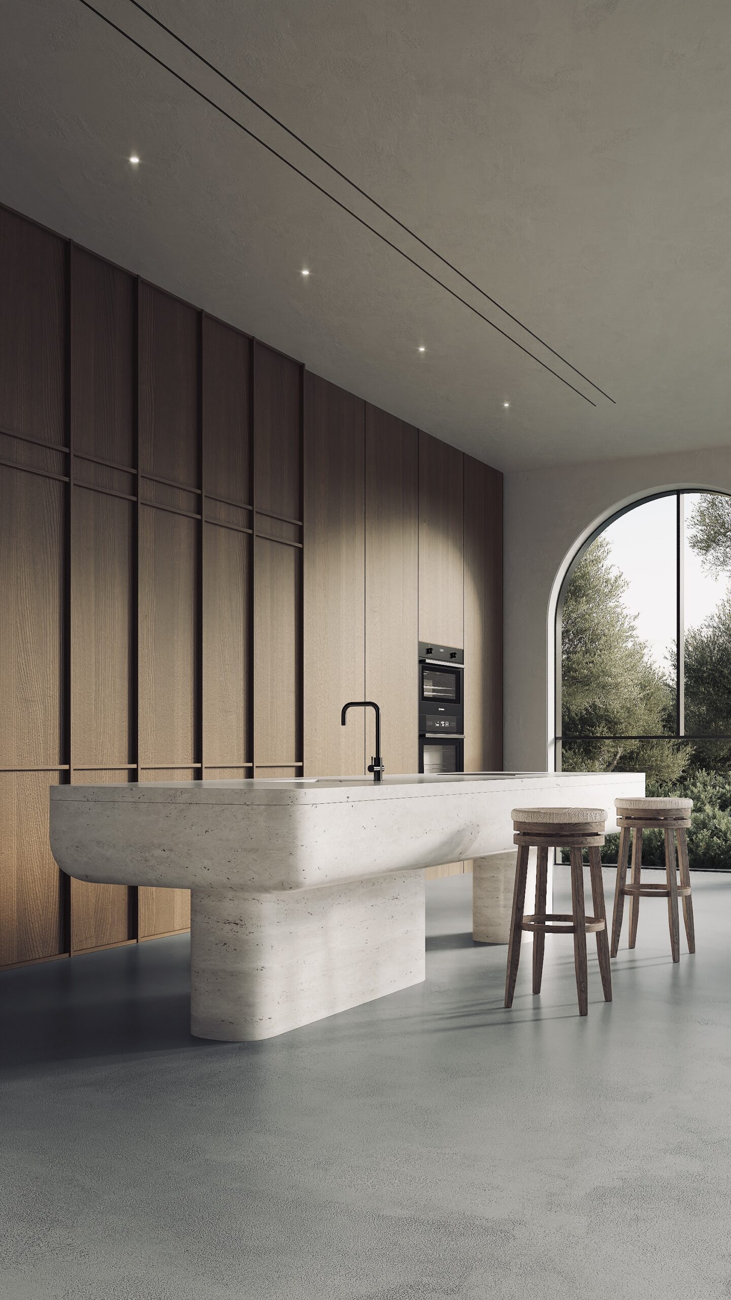 A STRIKING VILLA ON RHODES ISLAND BLENDS MINIMALISM WITH MEDITERRANEAN WARMTH. SOARING HIGH CEILINGS CREATE AN AIRY, EXPANSIVE ATMOSPHERE, WHILE RICH WOODEN WALLS INTRODUCE TEXTURE AND NATURAL ELEGANCE THROUGHOUT THE INTERIORS. THE KITCHEN FEATURES TRAVERTINE FINISHES, OFFERING A SUBTLE, SOPHISTICATED CONTRAST TO A SLEEK, MINIMAL ISLAND THAT ANCHORS THE SPACE.